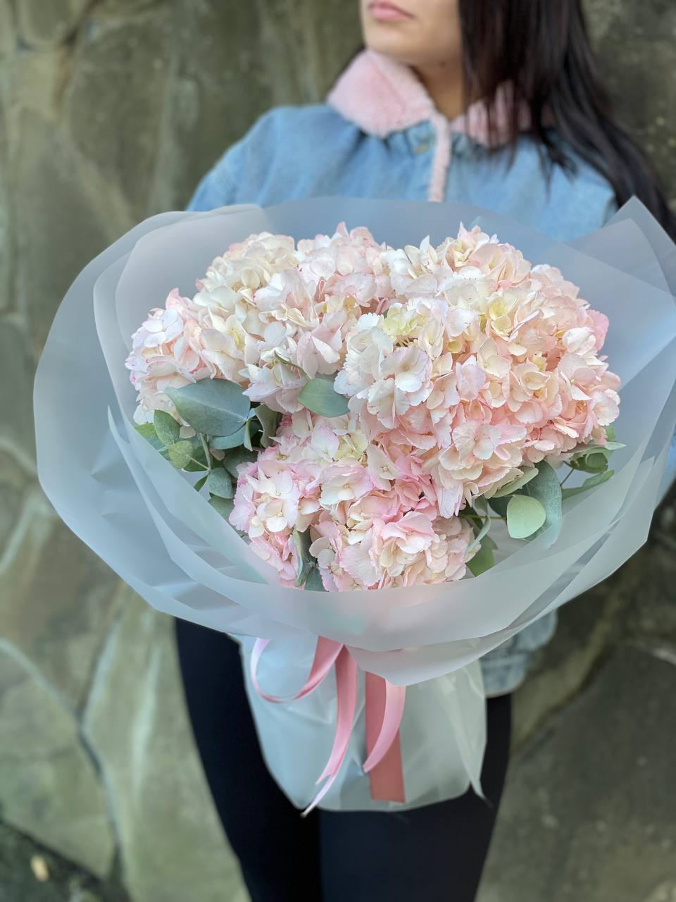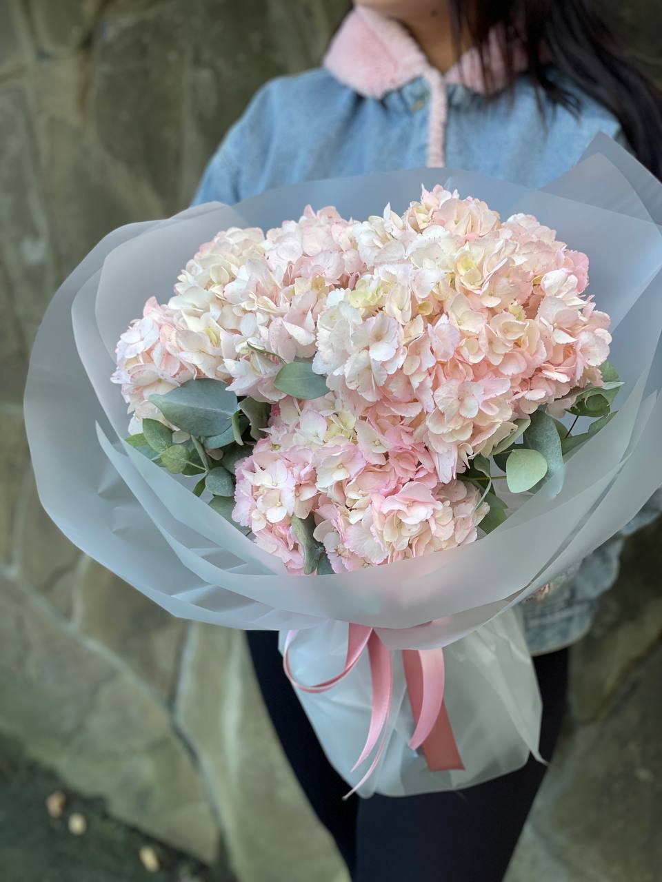 Пять пышных соцветий гортензии собраны в плотный букет с ветками эвкалипта. Розовый оттенок лепестков создаёт мягкое облако цвета, а зелень добавляет свежести композиции. Такой формат хорош для интерьера в светлых тонах.
