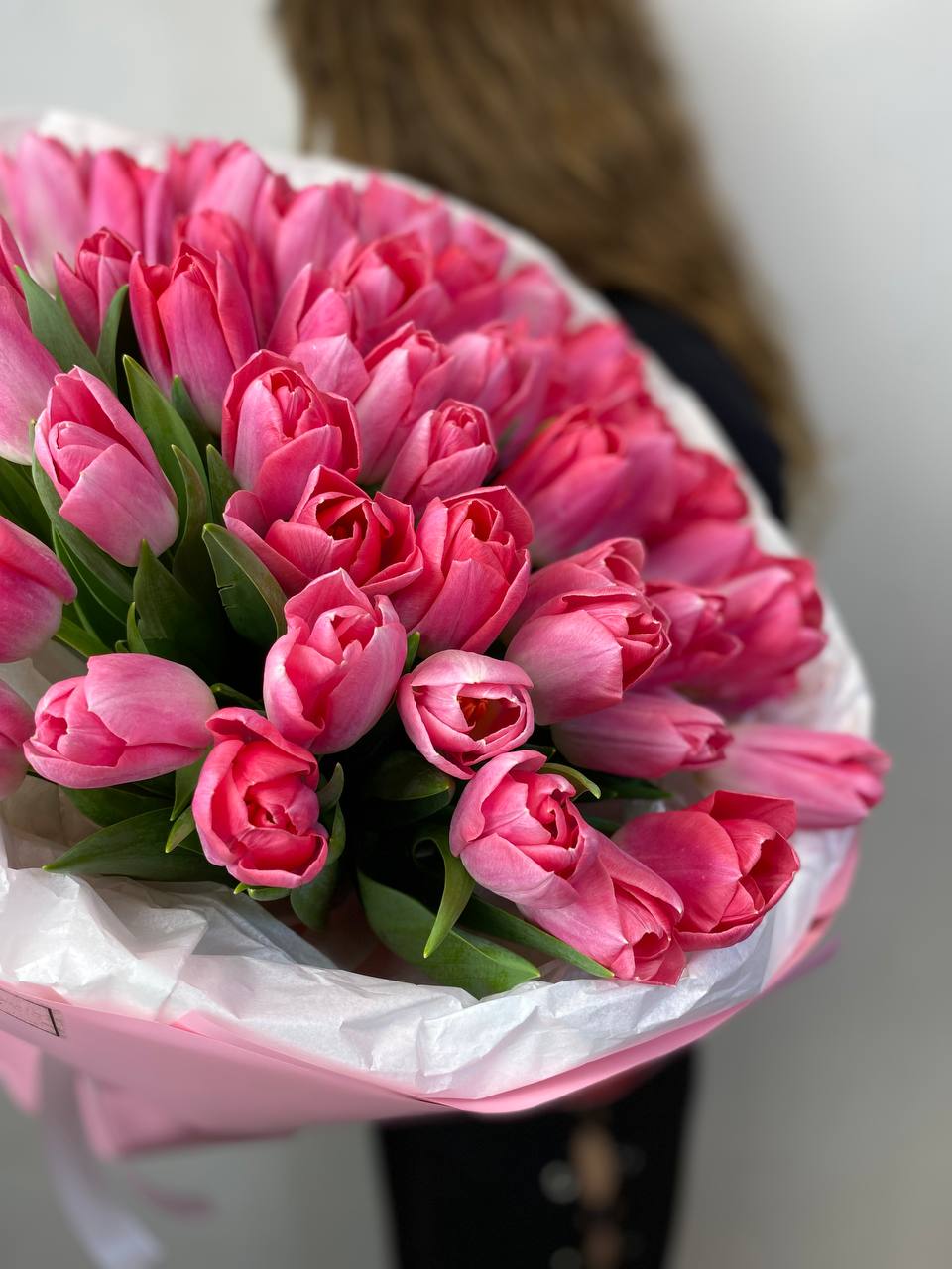 Букет из пятидесяти одного розового тюльпана держит форму благодаря плотной сборке и остается свежим долгое время. Практичное решение для тех, кто ценит естественную красоту без лишнего декора.