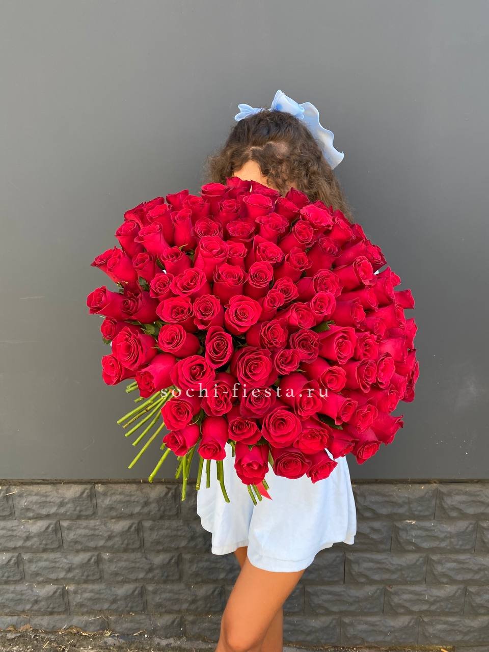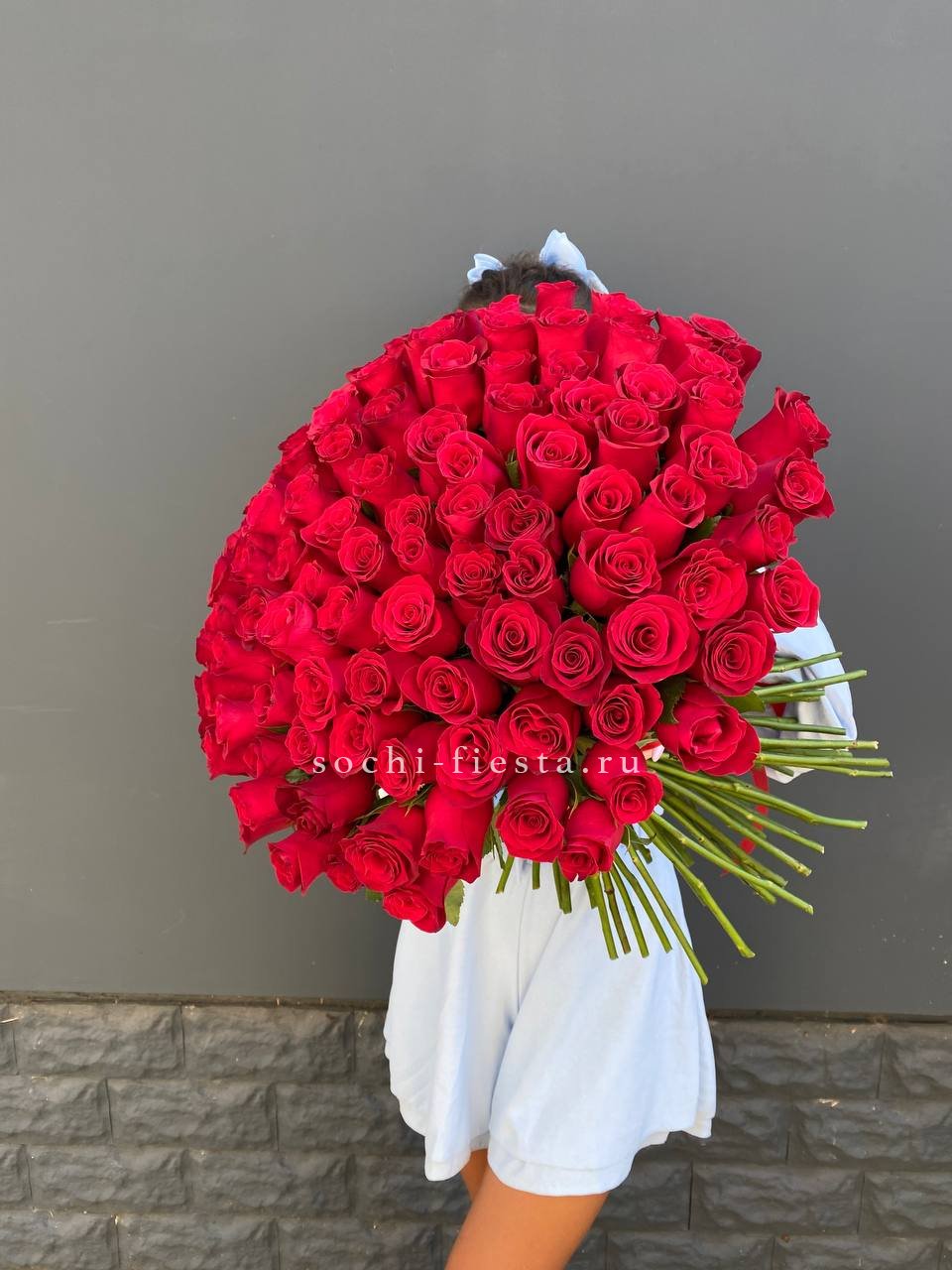 Пятьдесят пять бутонов собраны в плотную округлую форму, где каждый цветок читается отдельно. Красный здесь звучит насыщенно и глубоко, создавая мощное визуальное присутствие. Букет держит форму и занимает пространство уверенно.