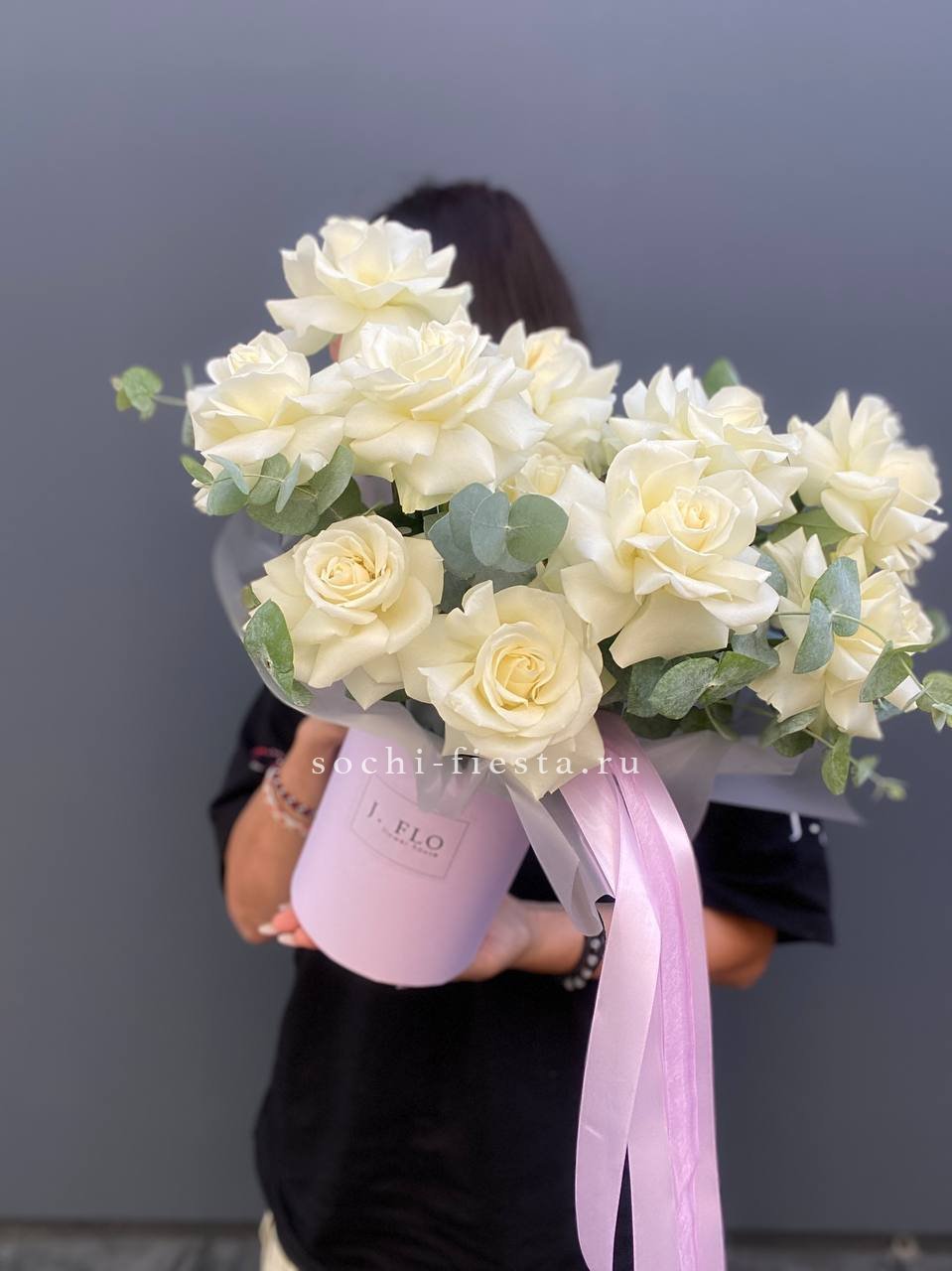 Девять пышных соцветий собраны в композицию с насыщенным объемом. Переход от белого к голубому создает глубину и движение внутри букета.