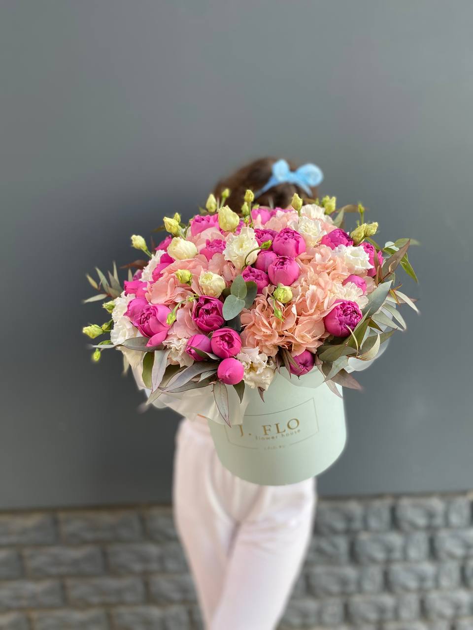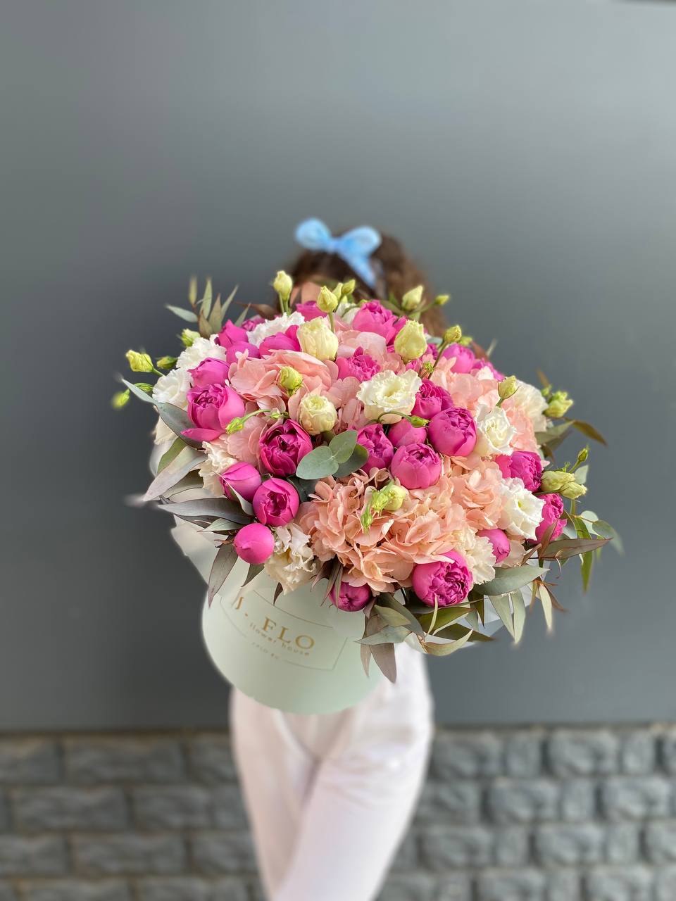 гортензия нежно-розовых оттенков, эустома, львиный зев или маттиола, розовые розы, эвкалипт, вспомогательная зелень, лента, светлая корзин.