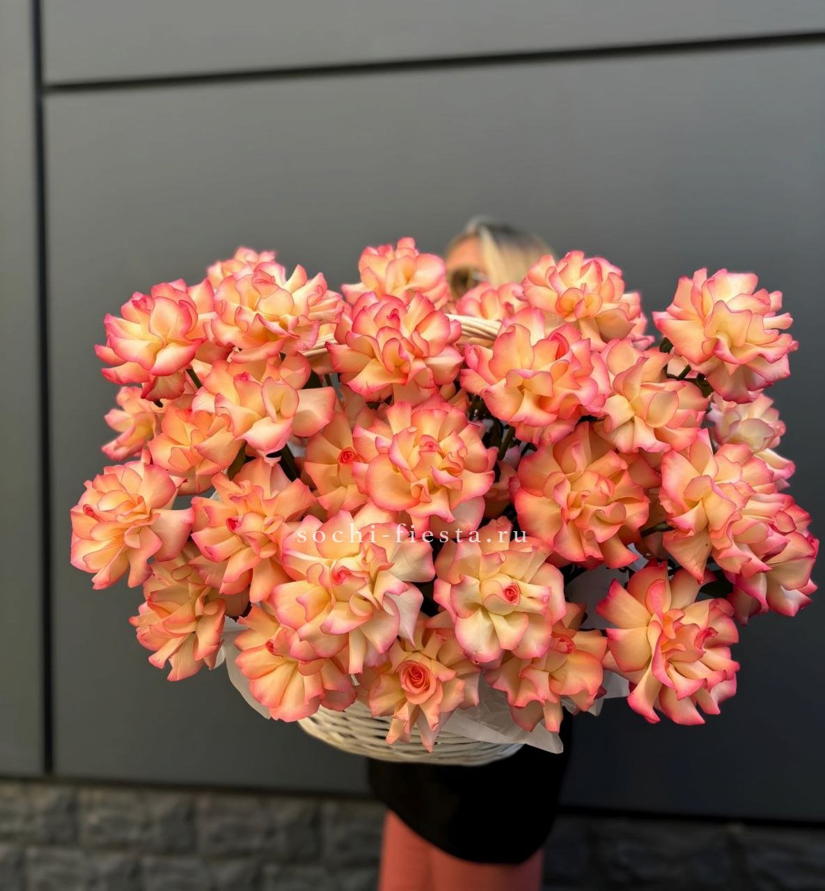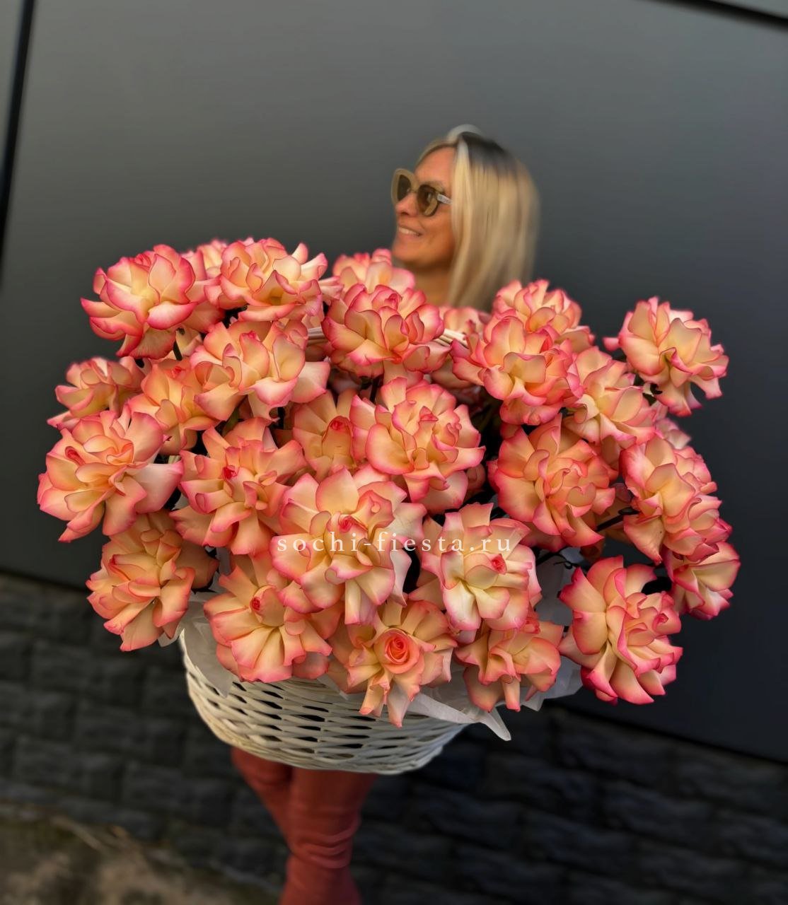 Сорок пять французских роз с вывернутыми лепестками образуют плотную композицию в плетёной корзине. Джумилия раскрывается широко и создаёт объёмную фактуру с глубокими переливами оттенков.