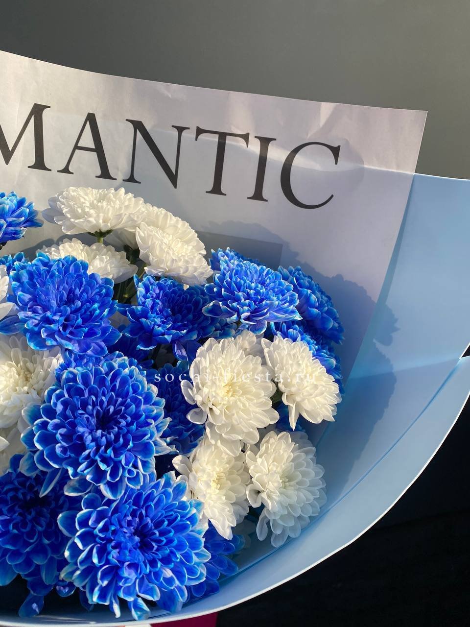 Девять веток кустовой хризантемы в синих оттенках собраны в плотный букет с лаконичной упаковкой. Насыщенный цвет и компактная форма создают яркое визуальное пятно в любом интерьере.