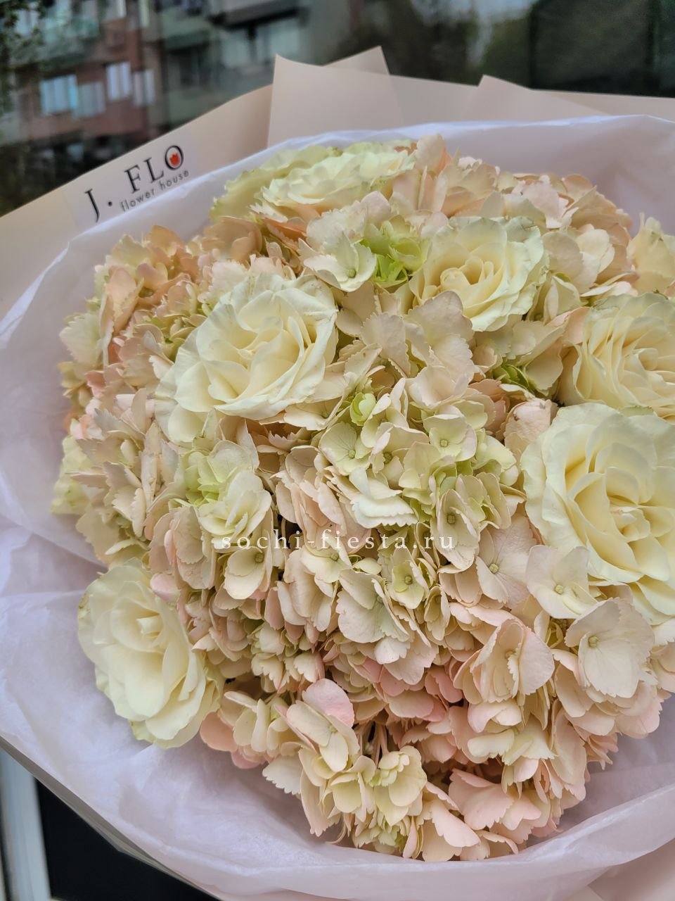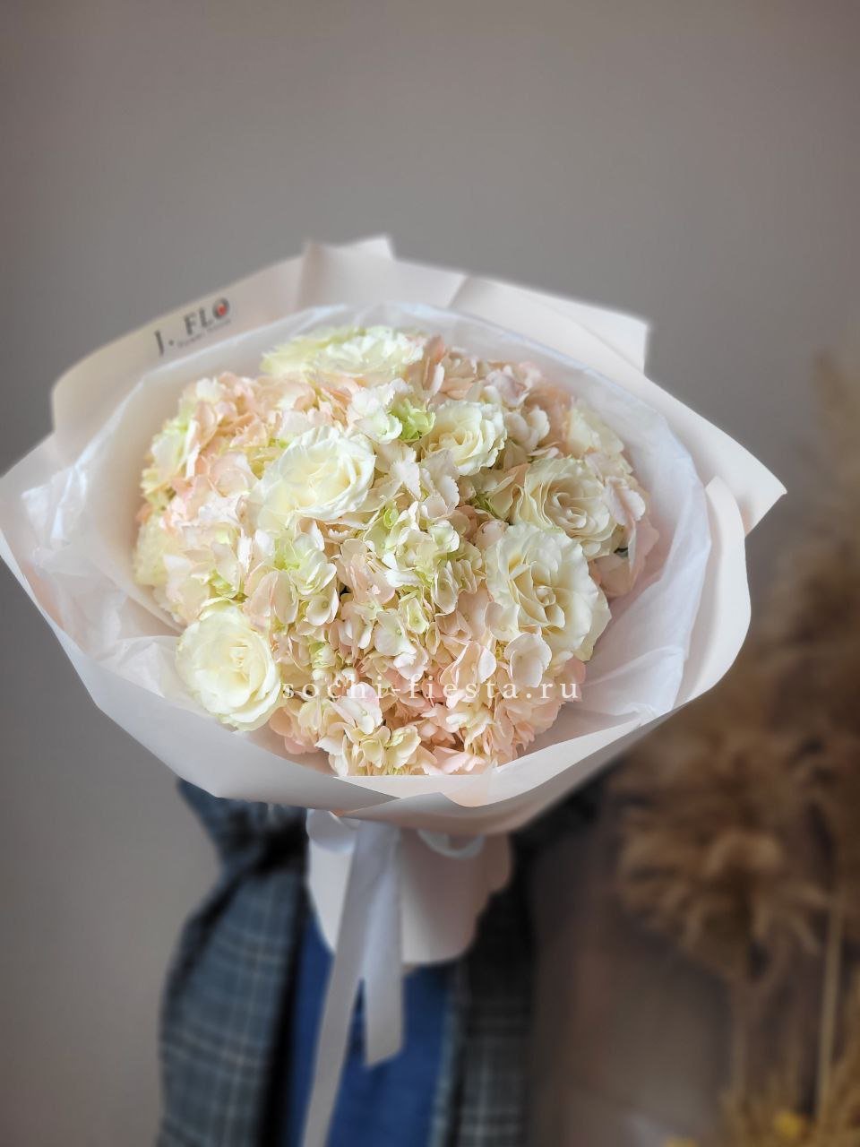гортензия, хризантема, белая роза, гербера, статица, хлопок, упаковка.