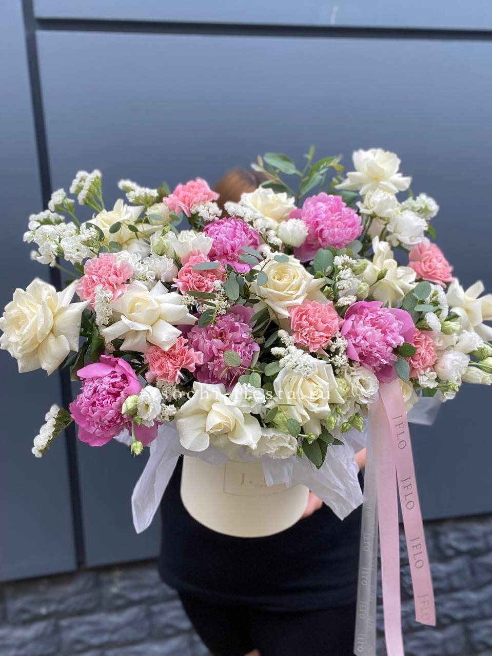 пионовидная роза, хамелациум (замена в несезон), эвкалипт, авторское оформление.