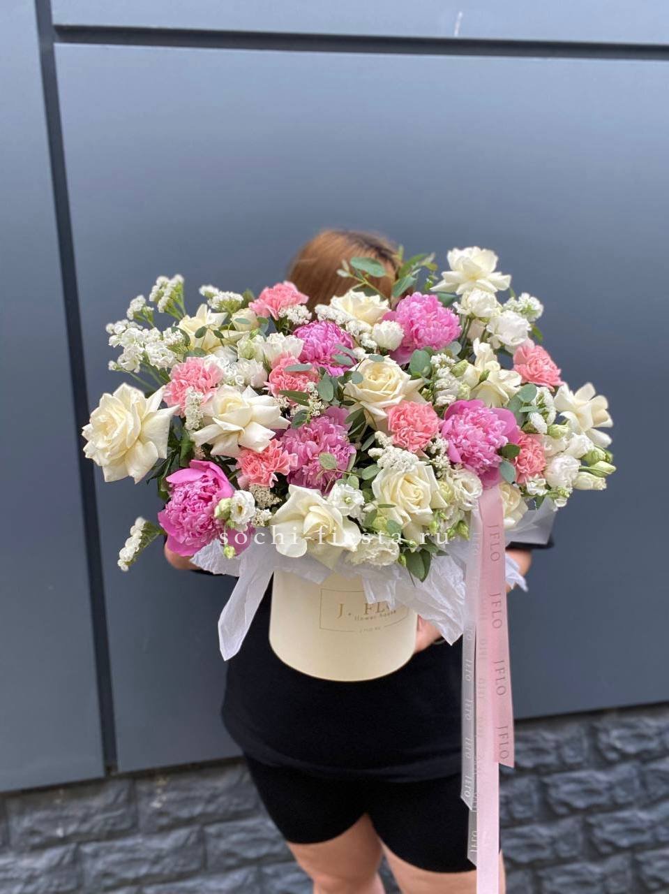 Пионовидные розы раскрываются густыми лепестками, хамелациум добавляет воздушности. Композиция держит форму и долго сохраняет свежесть.