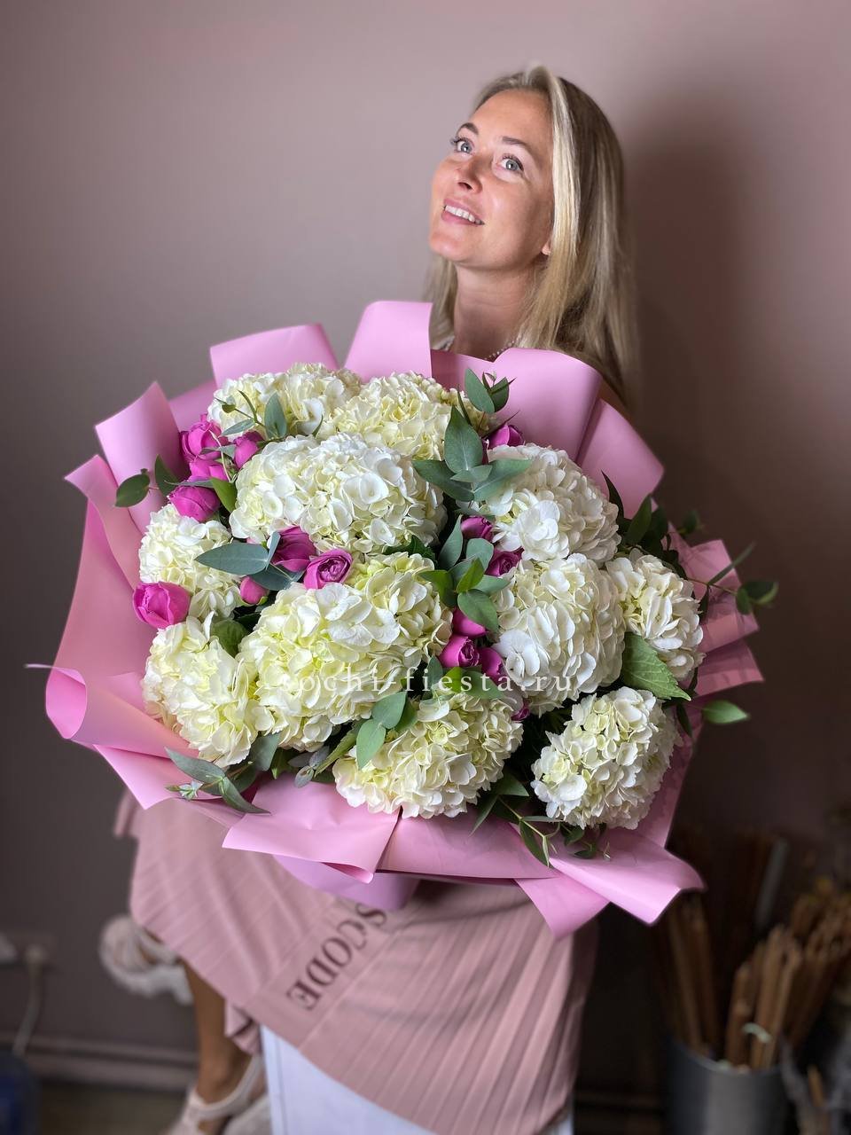 гортензия- 29 шт., дизайнерское оформление По желанию заказчика, композицию можно оформить в корзину.