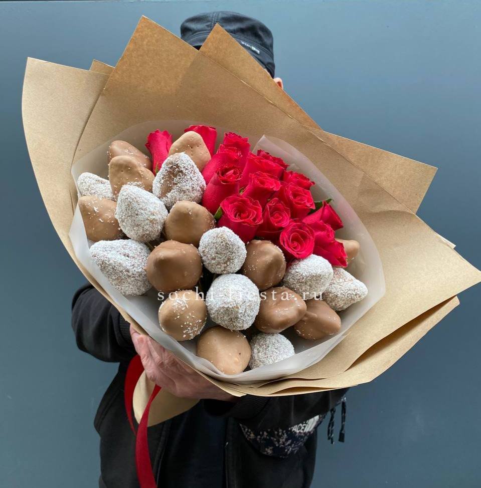21 клубника в шоколаде, розы- 15шт., лента, оформление.
