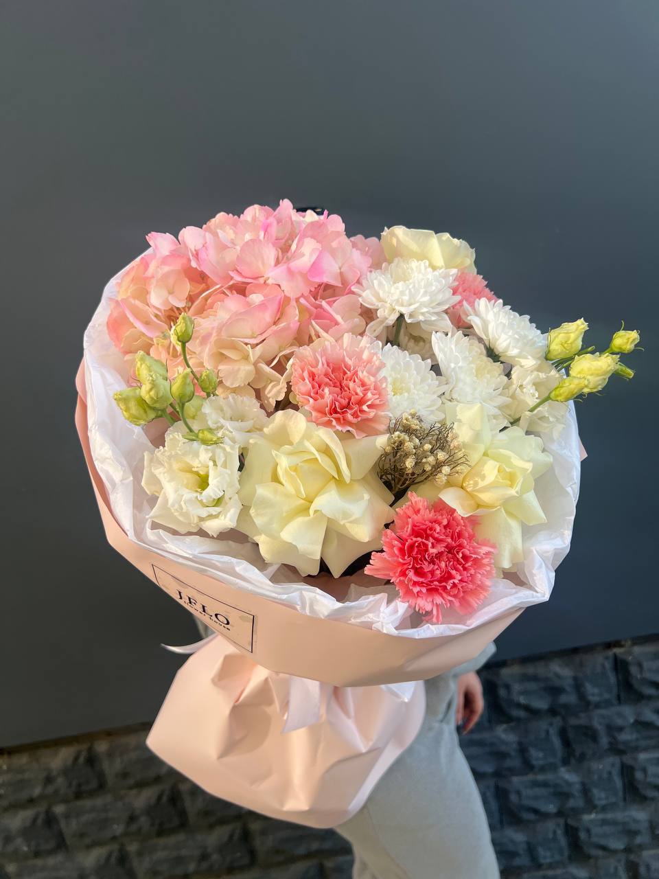 гортензия, герберы, эустомы, розы, диантус, эвкалипт, лента, дизайнерская упаковка.