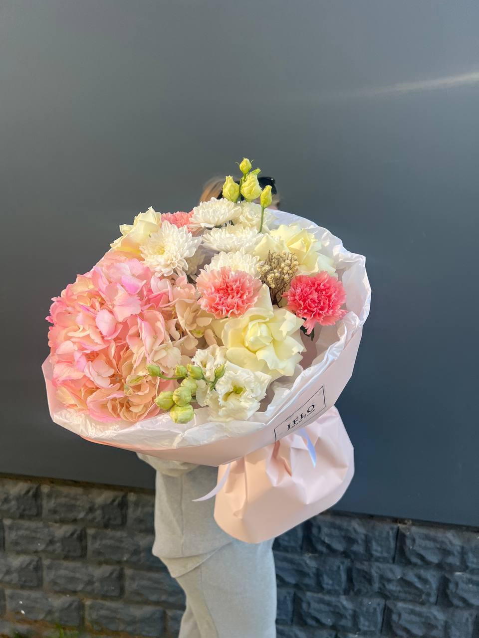 Яркая палитра собрана в динамичную композицию с выразительным объёмом. Гортензия задаёт пышную основу, герберы и эустомы добавляют цветовые акценты, эвкалипт вносит свежую ноту. Boom-букет звучит открыто и жизнерадостно.