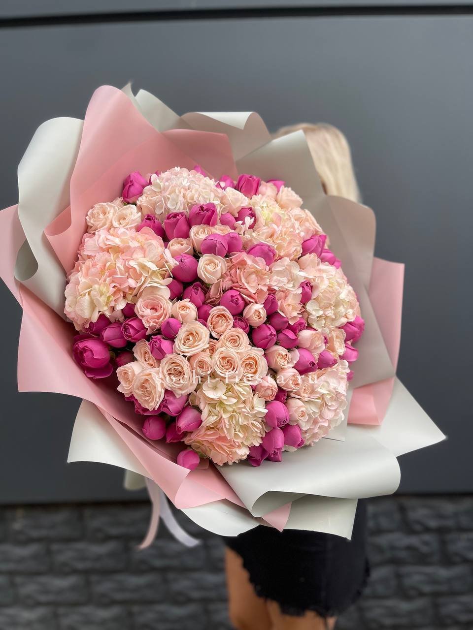 Пастельная гамма с лёгким касанием зимнего воздуха. Кустовые розы и диантус окружены воздушным ковылём, создавая мягкую текстуру с едва уловимой графикой. Гортензия добавляет объём, не перегружая силуэт.