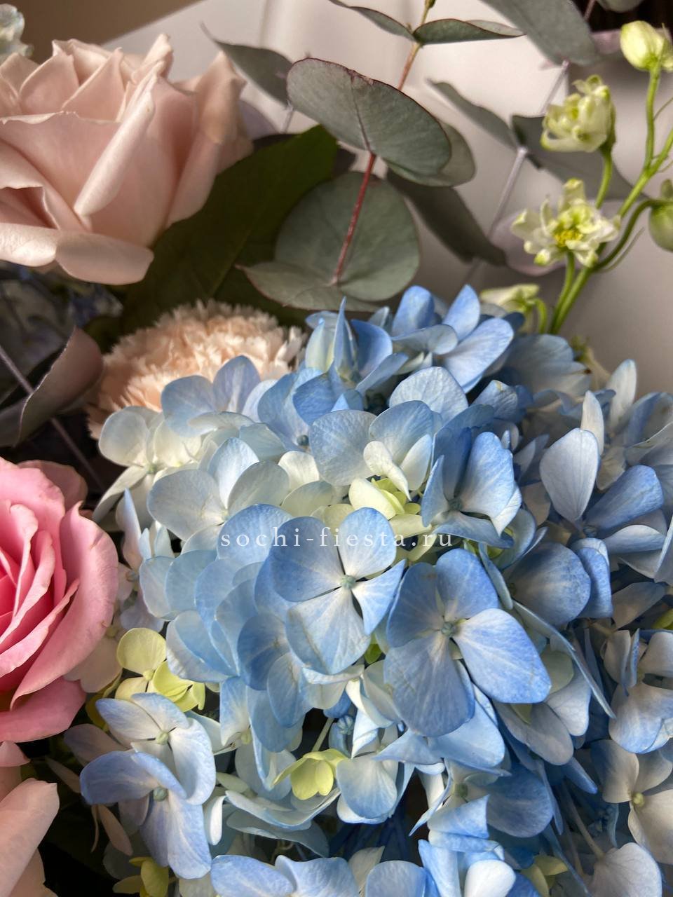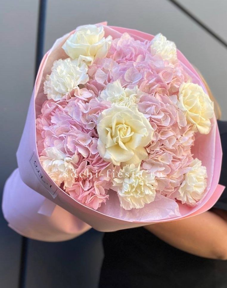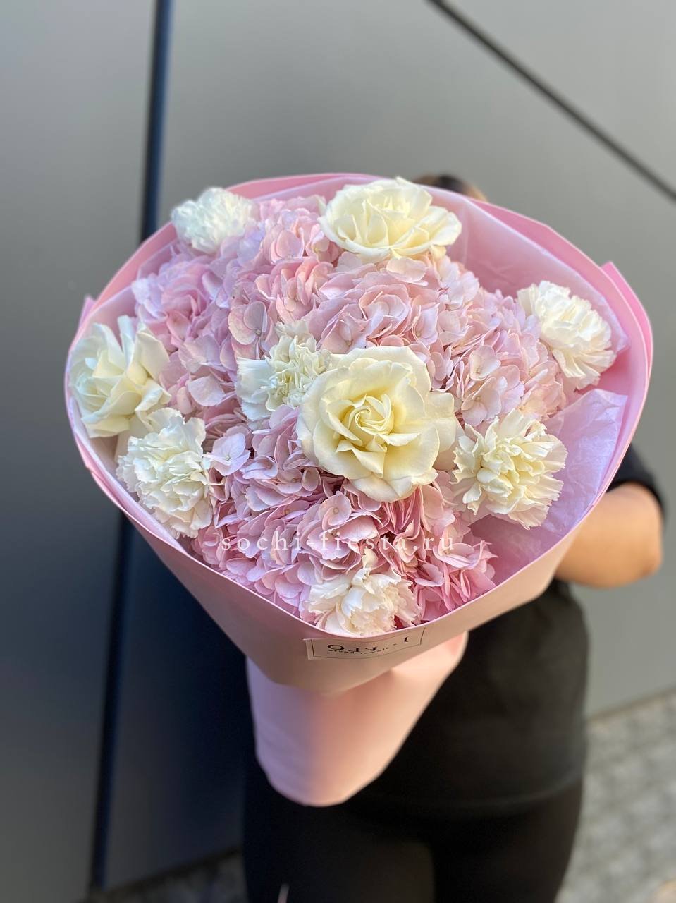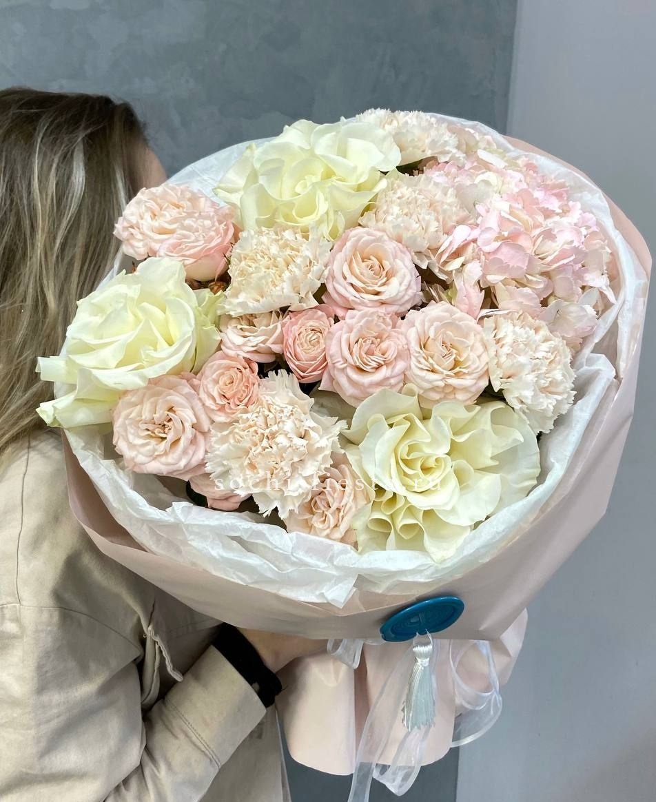 Белые розы и эустома образуют воздушный объем, где каждый бутон дышит свободно. Диантус добавляет графичности, а эвкалипт создает прохладную дымку по краям. Букет для тех, кто ценит легкость и современную флористику.