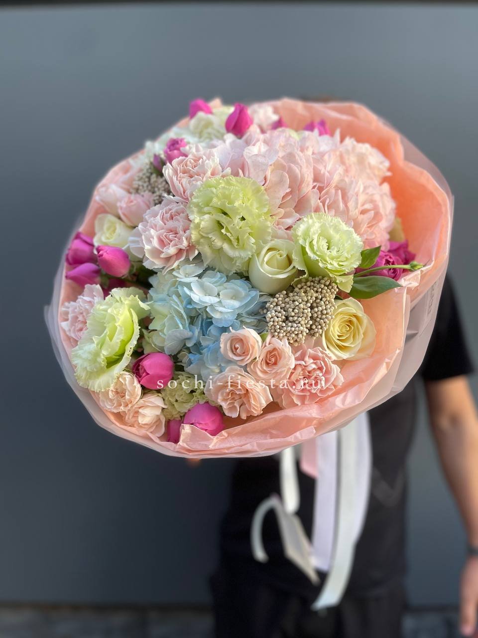 Крупные соцветия гортензии задают основной объем, а эустома и диантус разбивают плотность воздушными бутонами. Мисти баблс и озотамус рассыпаются между цветами, добавляя движение и легкость всей композиции.