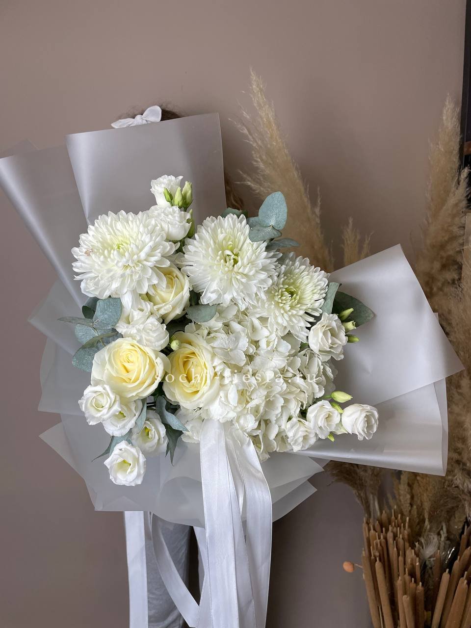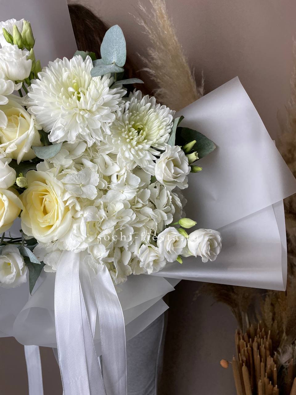 Воздушные соцветия лагуруса создают мягкую дымку вокруг роз и хризантем. Букет собран с ощущением лёгкости и простора, словно морской бриз коснулся каждого лепестка.