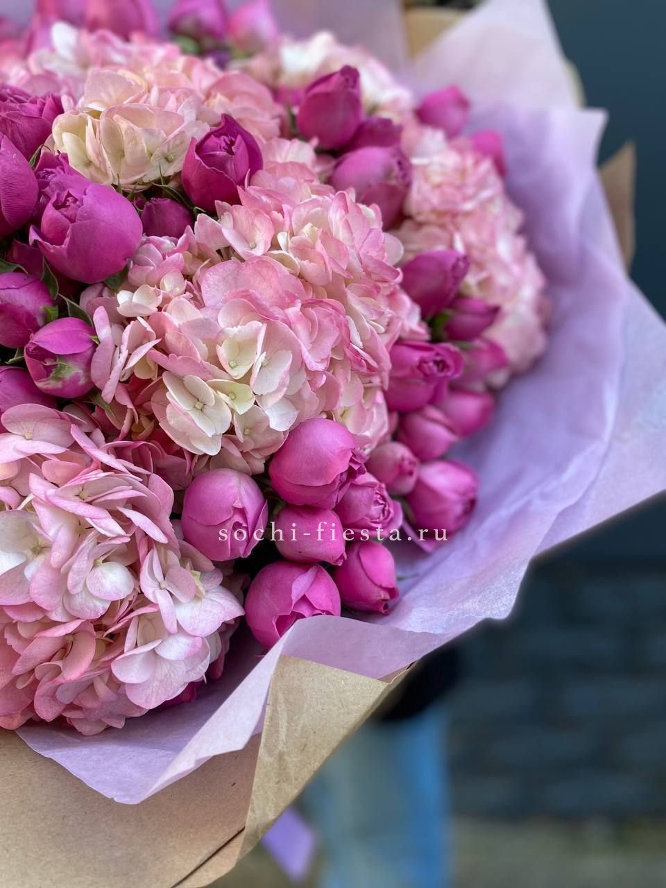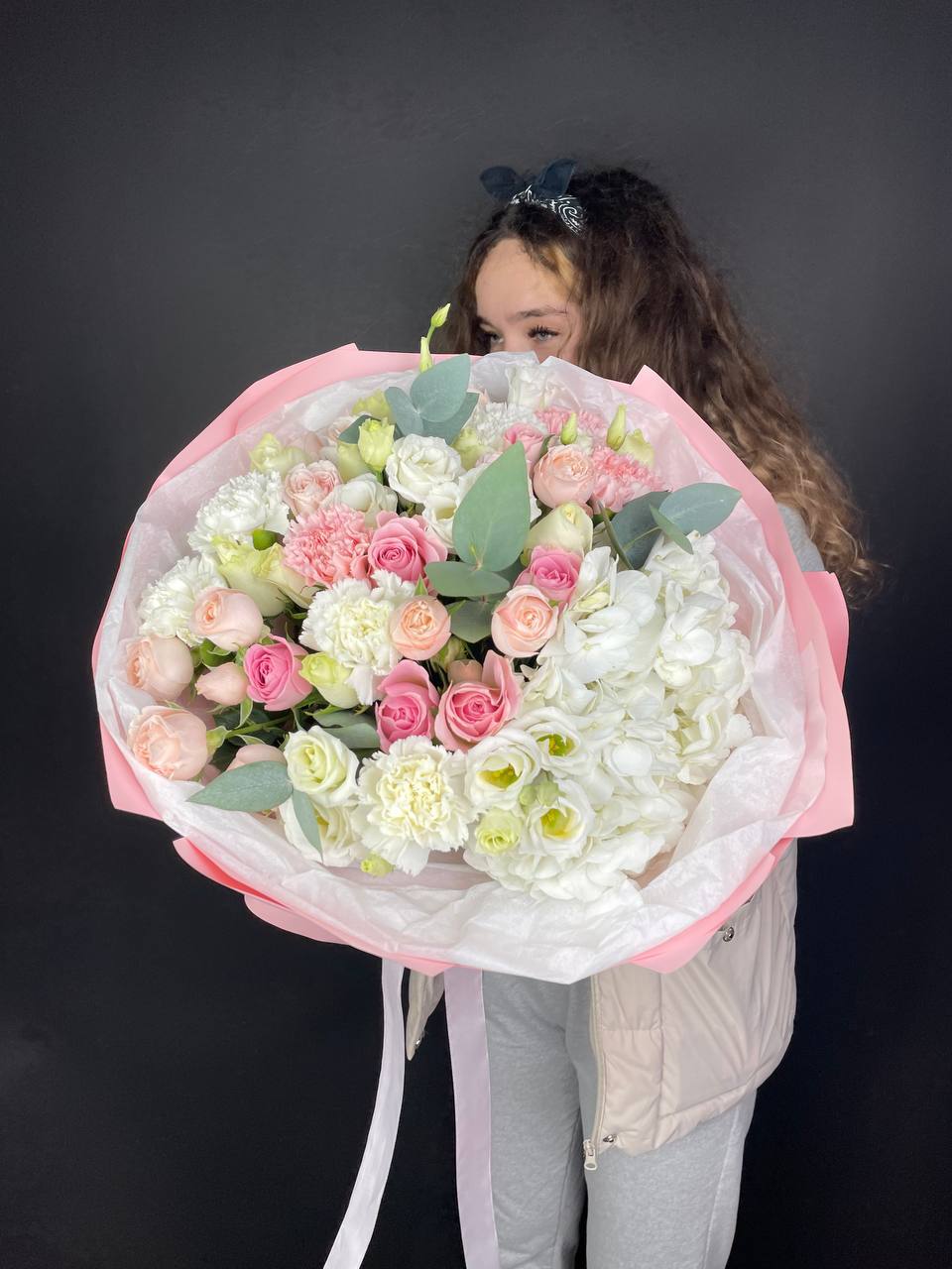 гортензия, хризантема, хамелациум, гербера, мисти баблс, диантус, пленка.