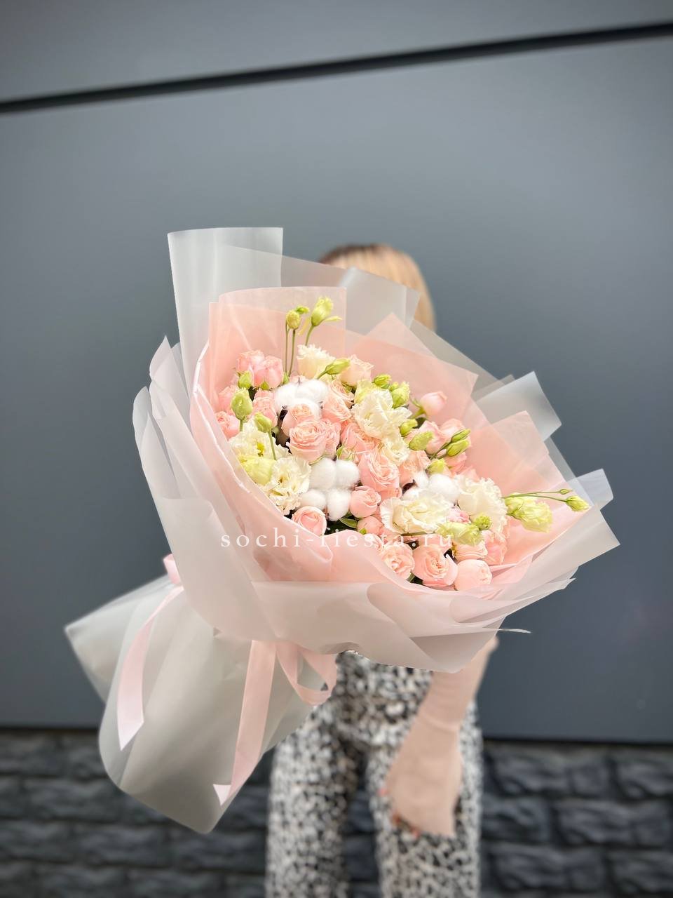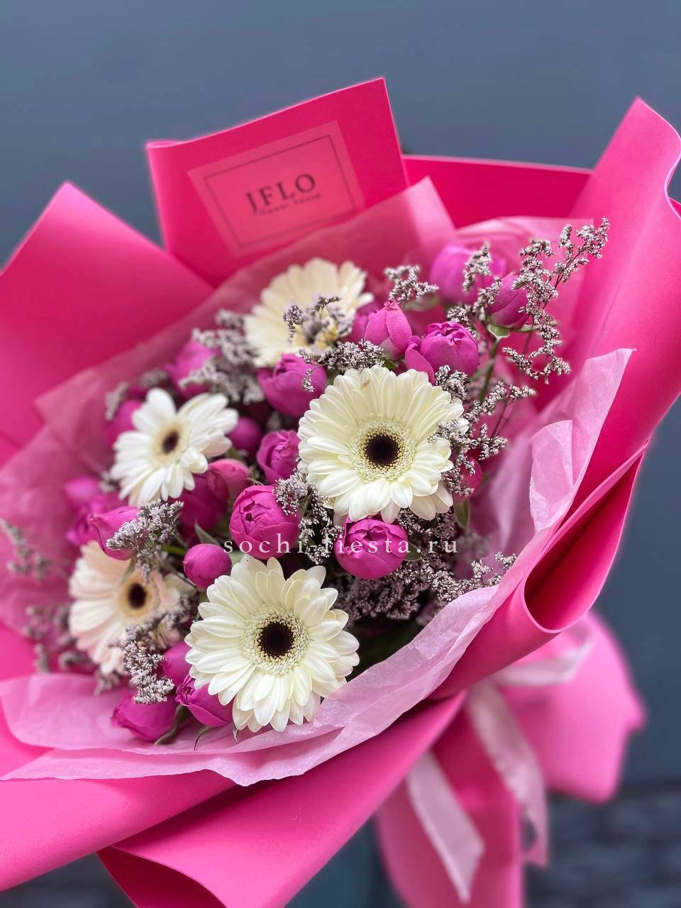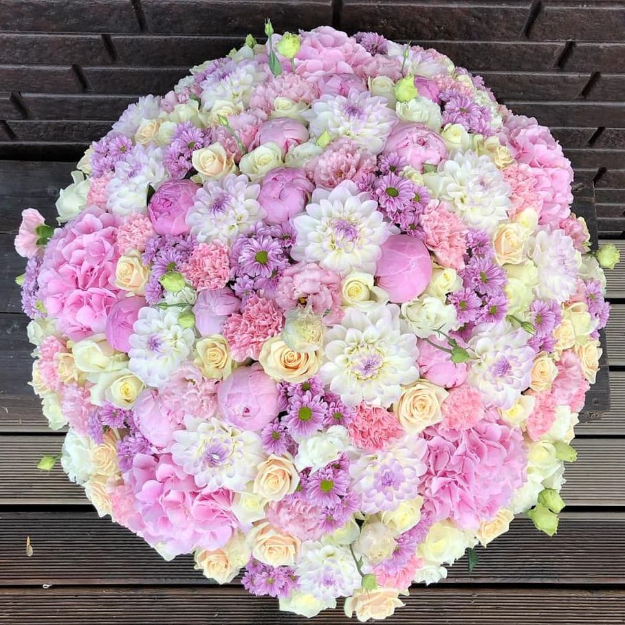 Монохромная палитра с многослойной структурой. Французские розы и эустомы чередуются с кустовыми бутонами, гортензии заполняют объём, а диантусы создают точечные акценты. Букет выглядит цельно и графично.