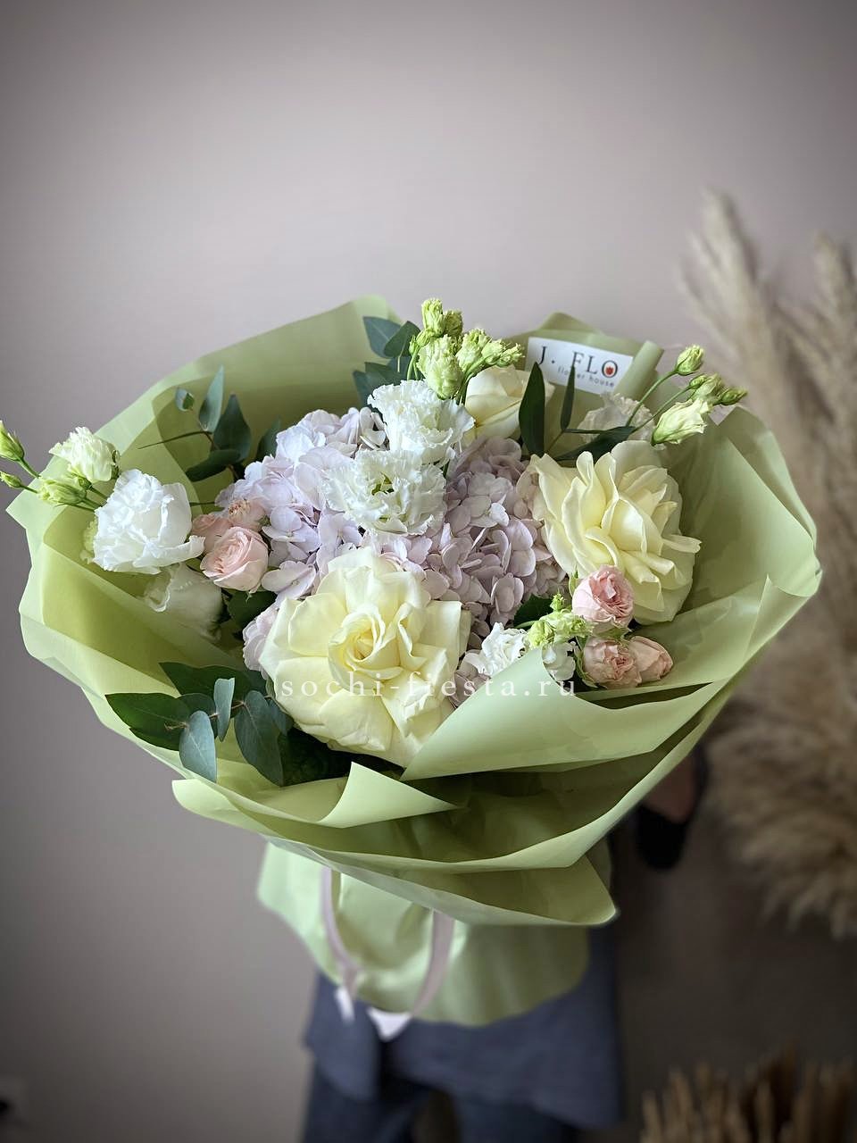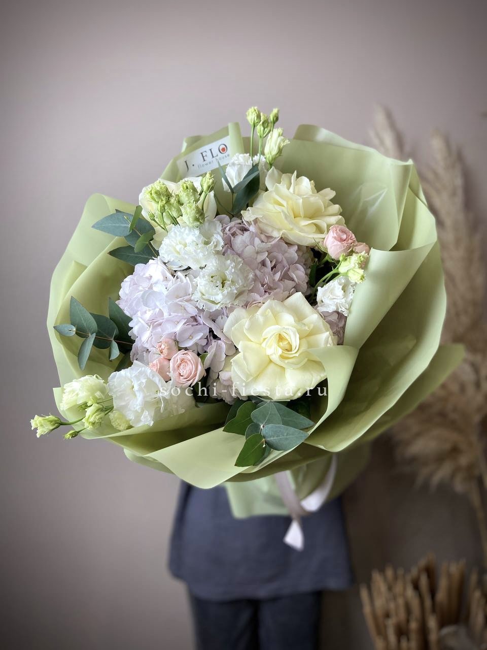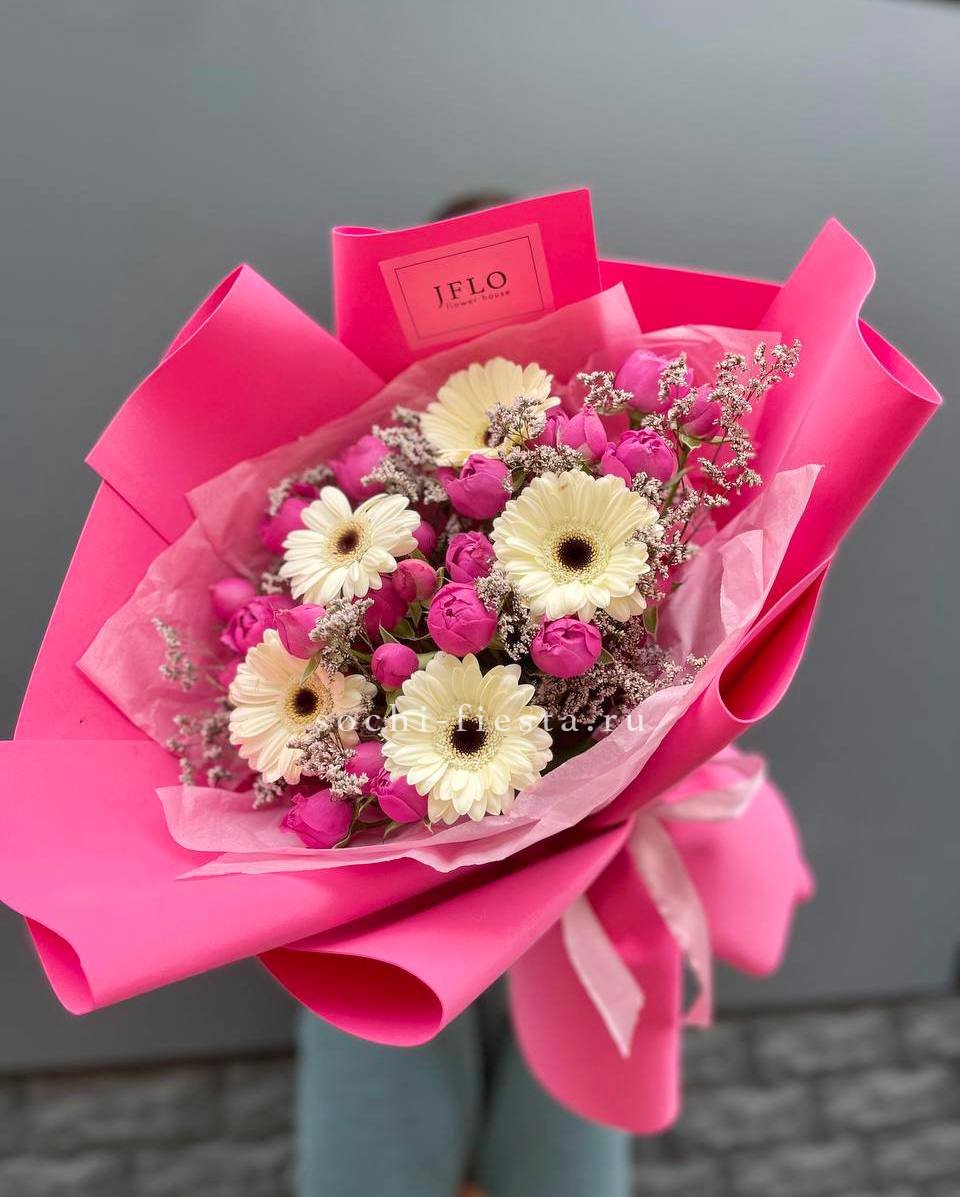 кустовые розы, гортензии, французские розы, диантусы, эустомы, лента и дизайнерская пленка.