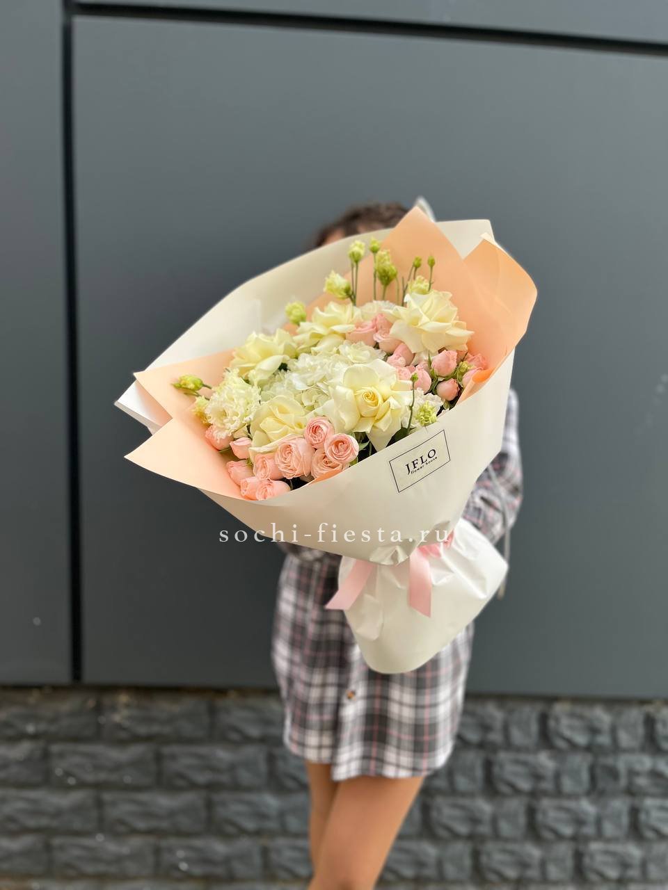 Воздушная композиция в пастельных тонах с пионовидными розами и гортензией создает объемную форму. Каждый бутон раскрывается слоями, а диантусы добавляют графичные точки среди крупных соцветий.