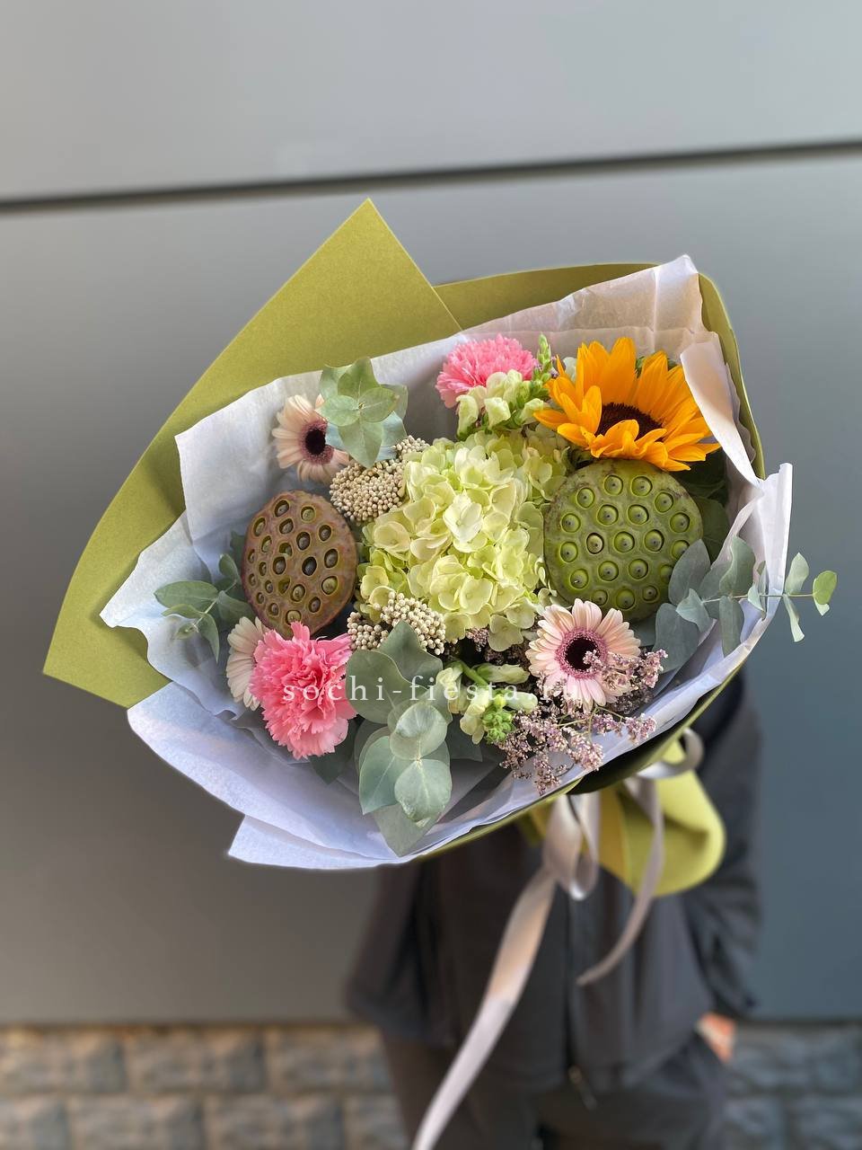 лотос, антирринум, диантус, подсолнух, озатамус, гортензия, гербера, лимониум, упаковка.