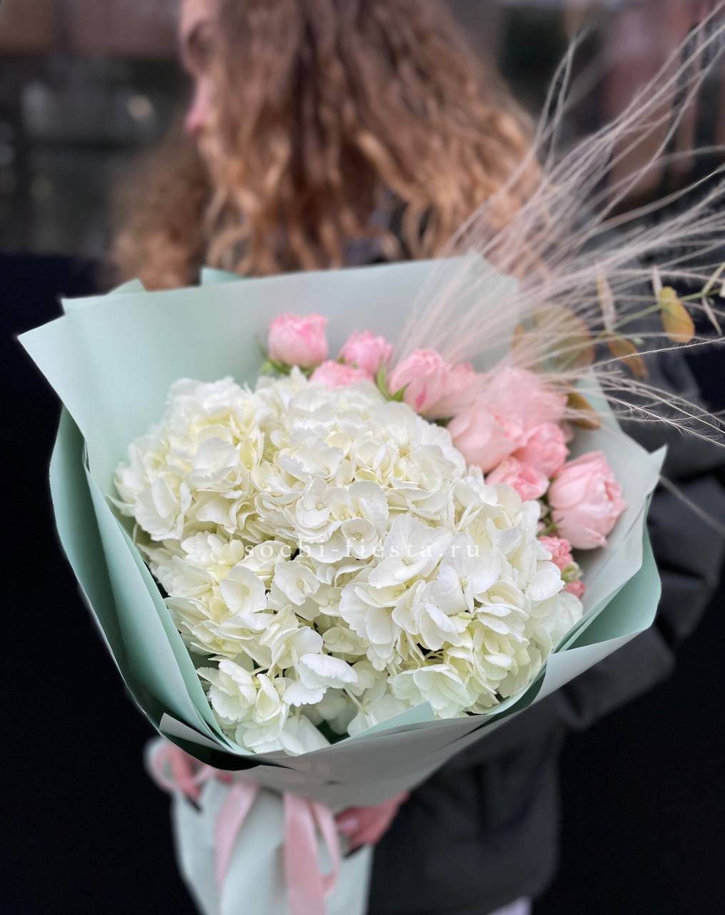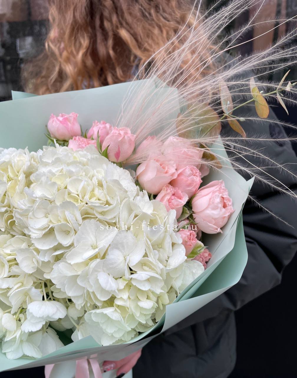 диантус, эустома, гортензия, хайди, эвкалипт, озатамус, пленка.