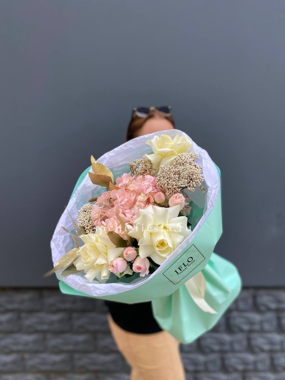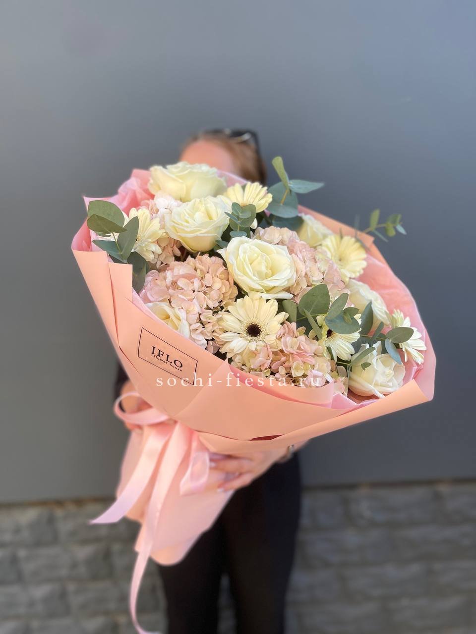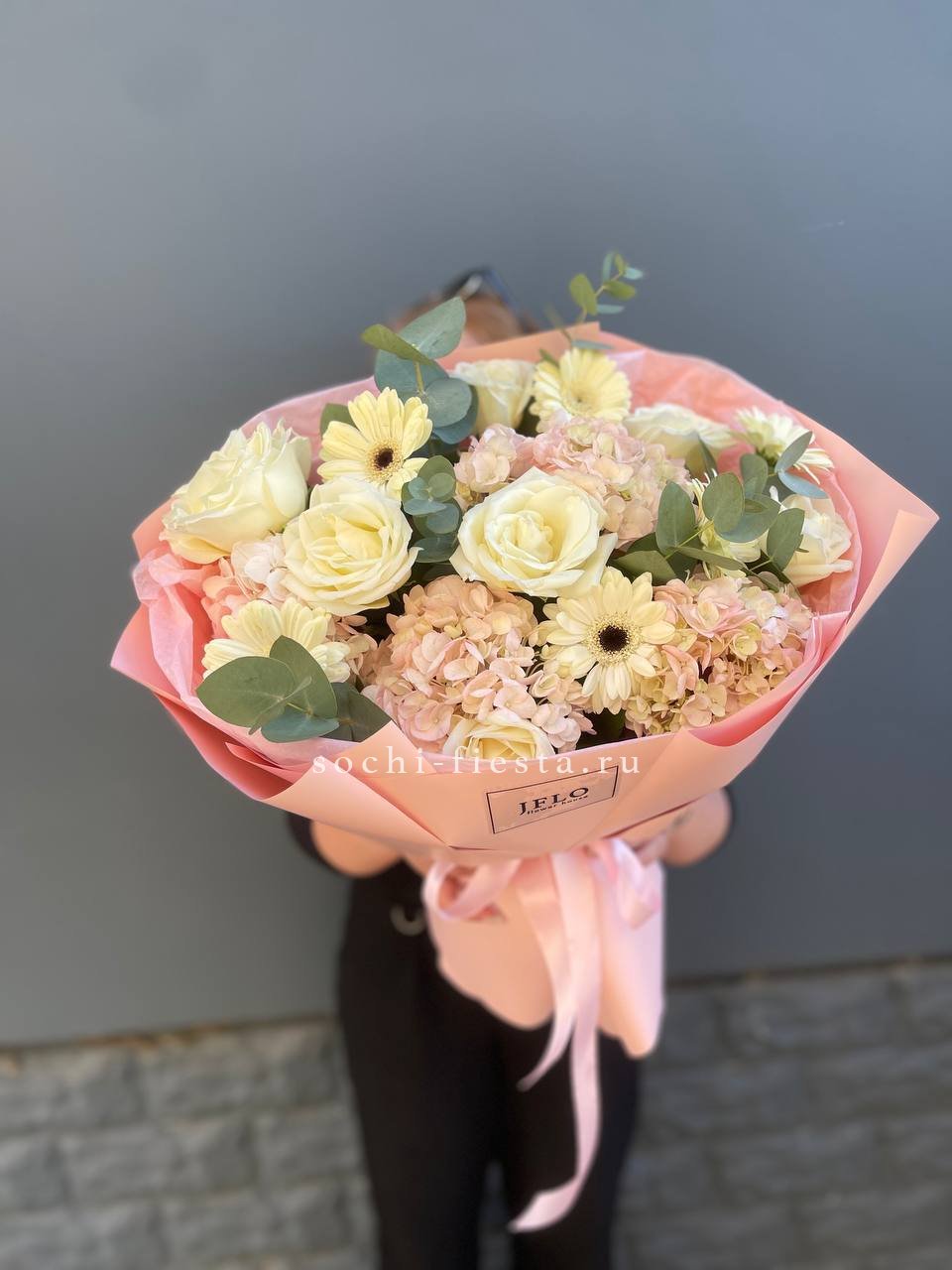 гербера, диантус, гортензия, бомбамстик, озатамус в нежном оформлении.