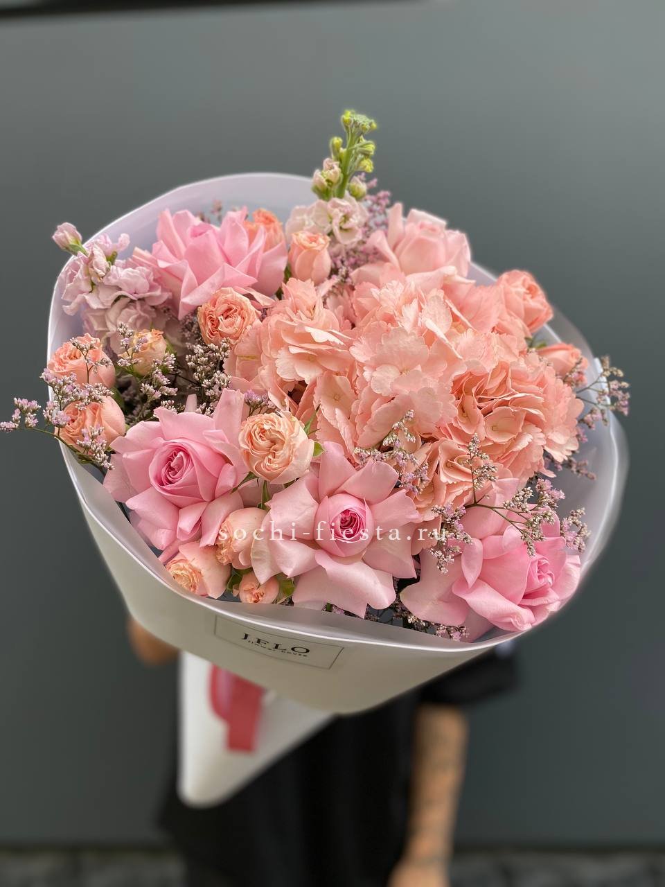 Воздушная гортензия окружена розовыми бутонами и душистой маттиолой. Лимониум добавляет букету лёгкую дымку, а общий силуэт остаётся мягким и собранным.