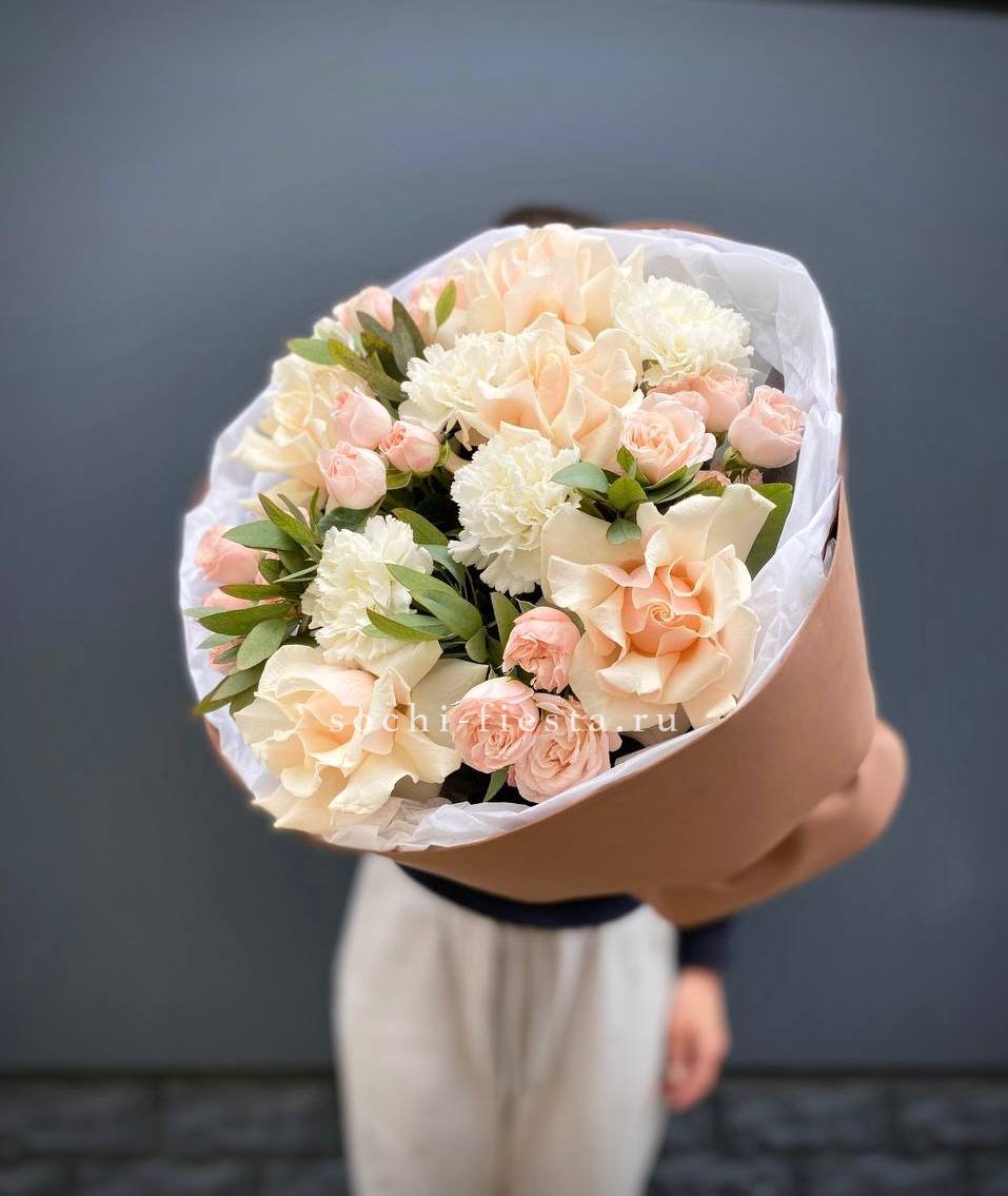 кустовые розы, кремовые розы, диантусы, эвкалипт лента и дизайнерская пленка.