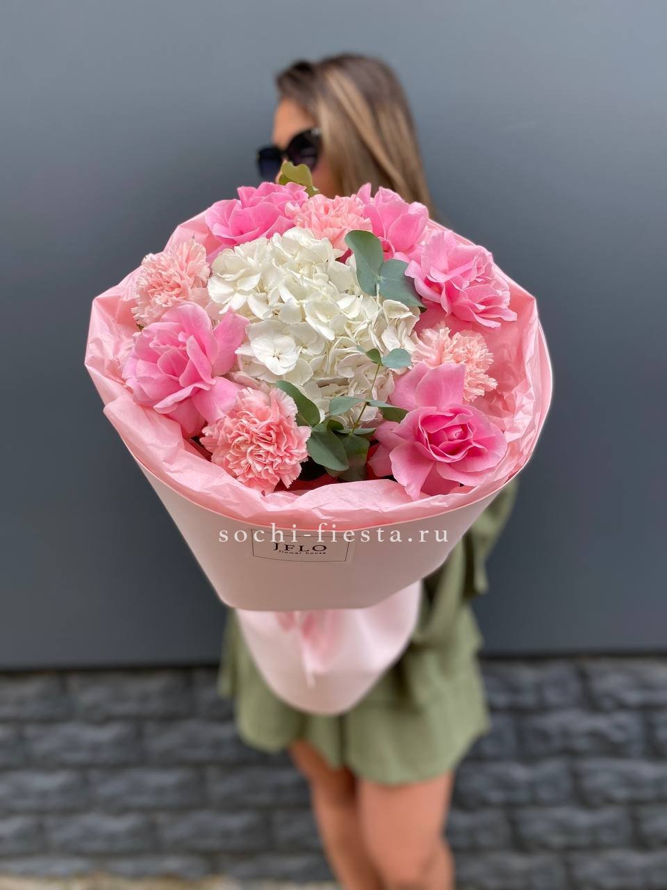 гортензия, пионовидные кустовые розы, орхидеи, нутан, протея, хамелациум, вспомогательная зелень, лента, дизайнерская упаковка.