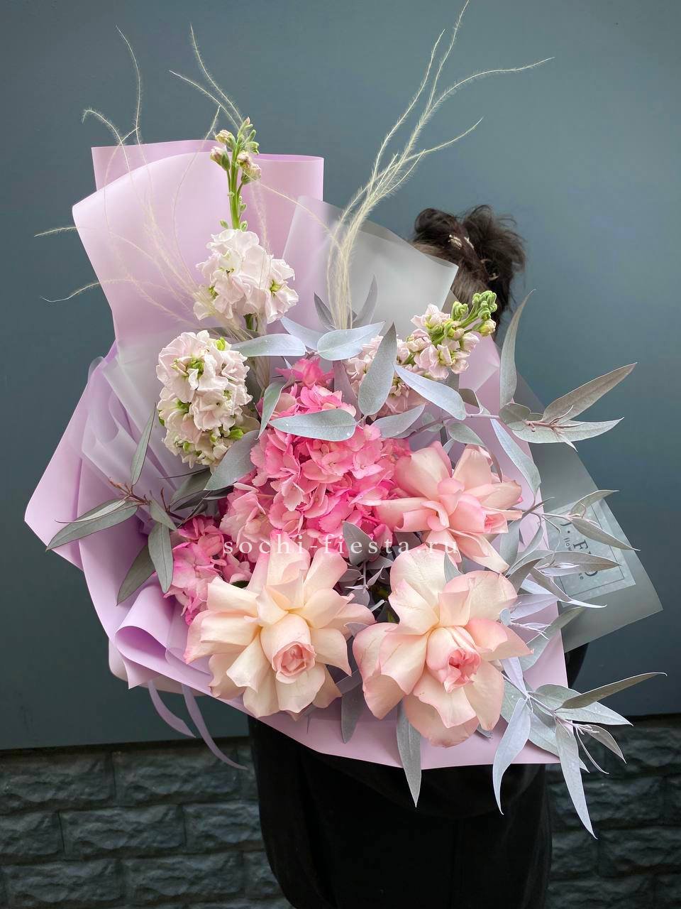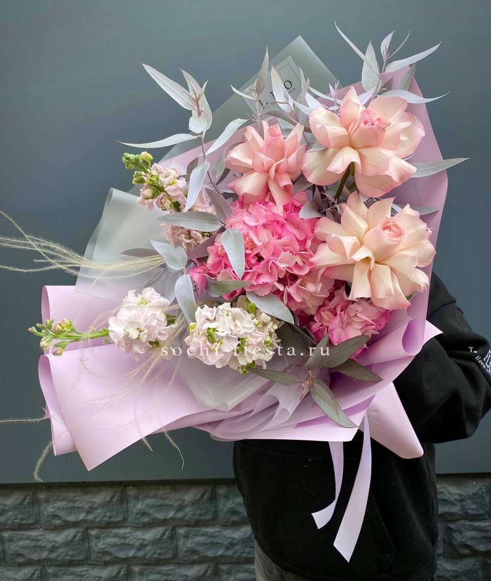 гортензия, пионовидные розы, эвкалипт, пампасная трава, лента, дизайнерская упаковка.