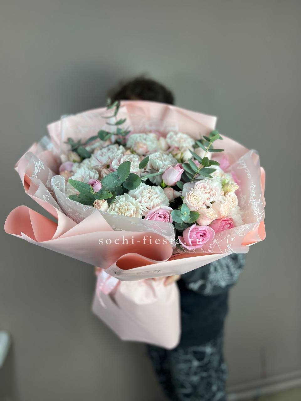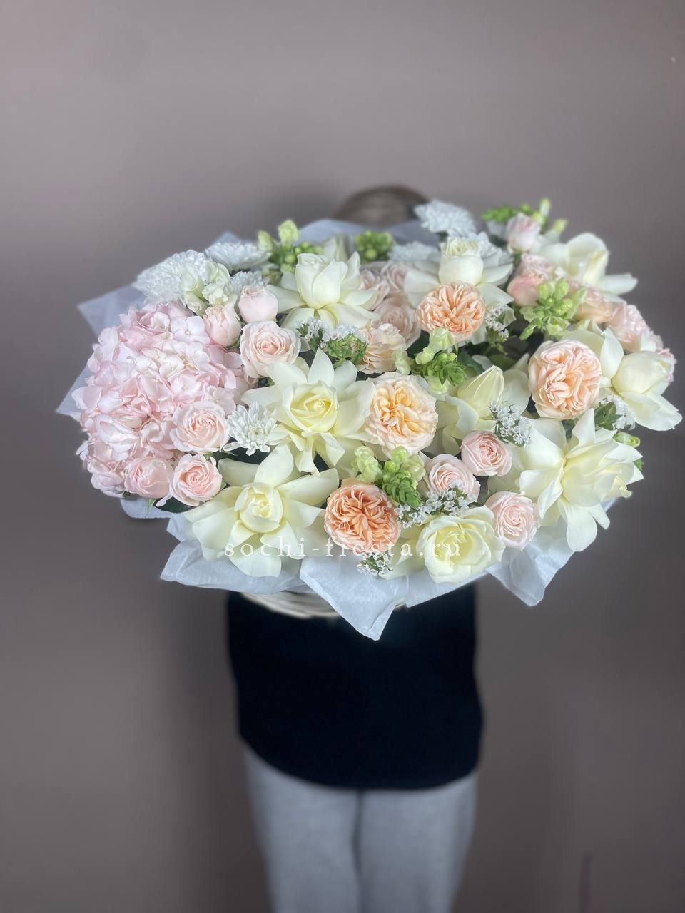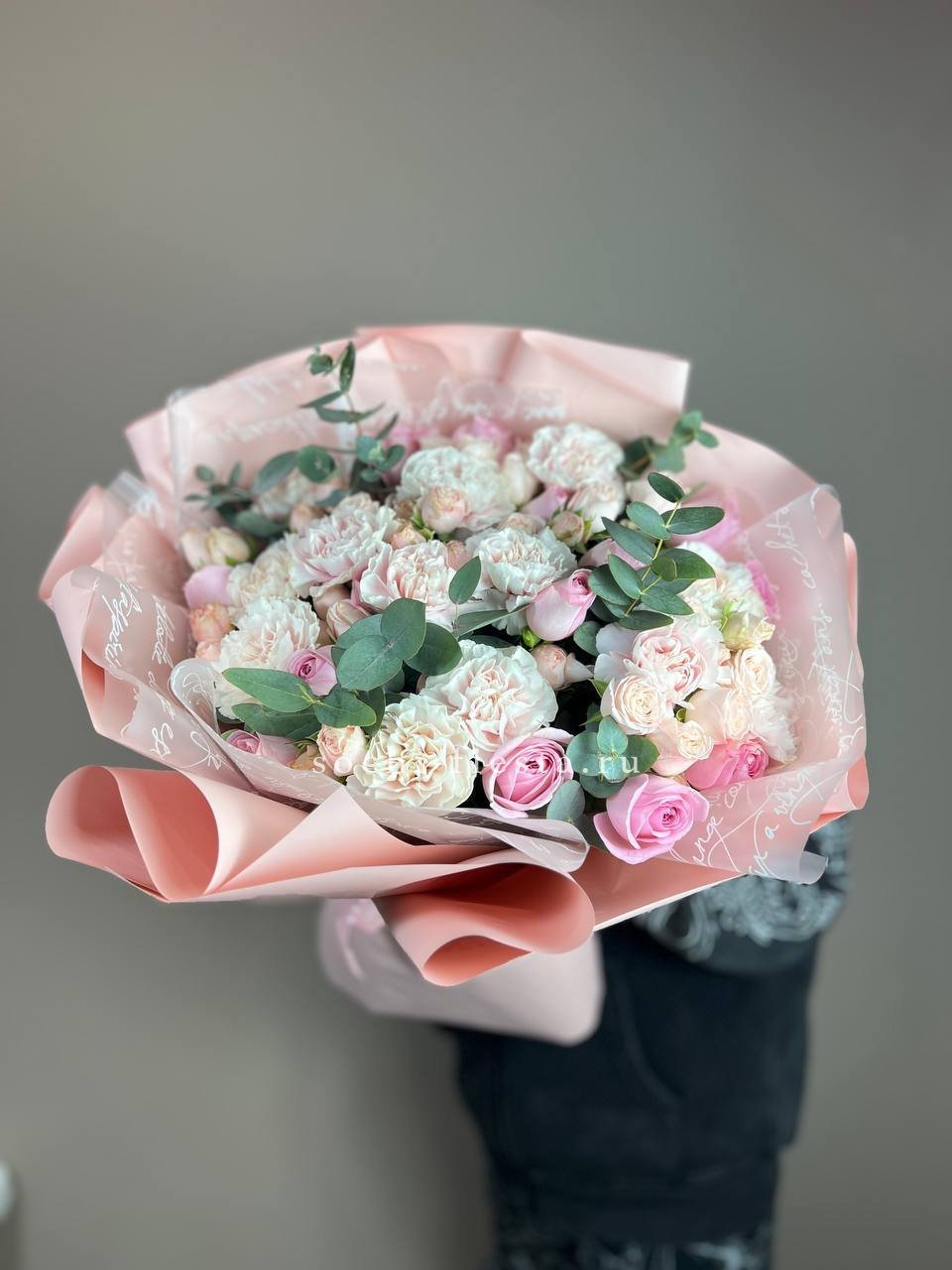 Пышная гортензия задает объем, а французские розы и эустома создают многослойную глубину. Диантусы добавляют графичные точки, эвкалипт обрамляет композицию мягкими линиями.