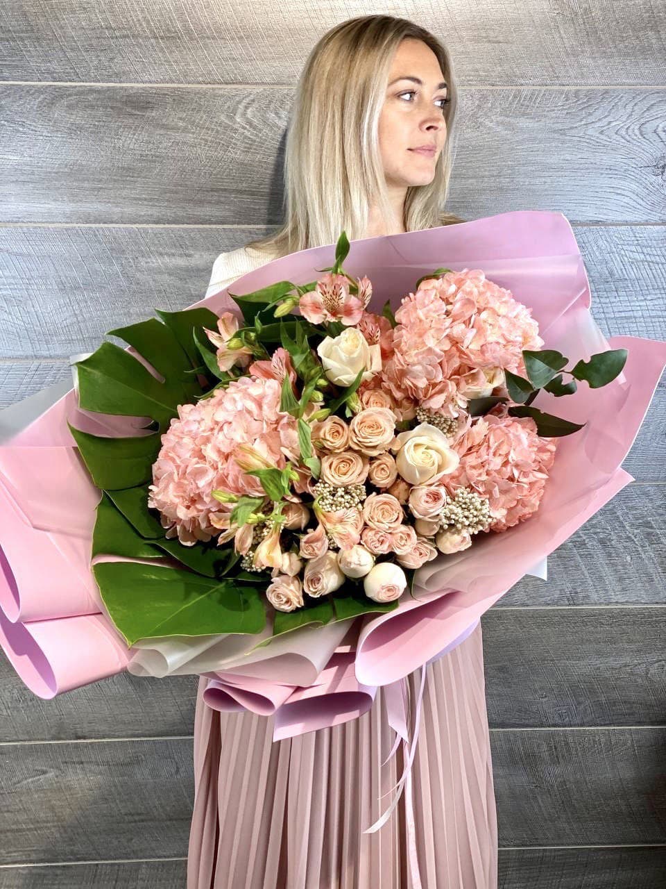Протея задаёт графичный центр композиции, вокруг которого раскрываются пышные шапки гортензий и плотные бутоны роз. Хамелациум и бомбастик создают воздушную текстуру по краям, а эвкалипт добавляет серебристые штрихи между крупными соцветиями.