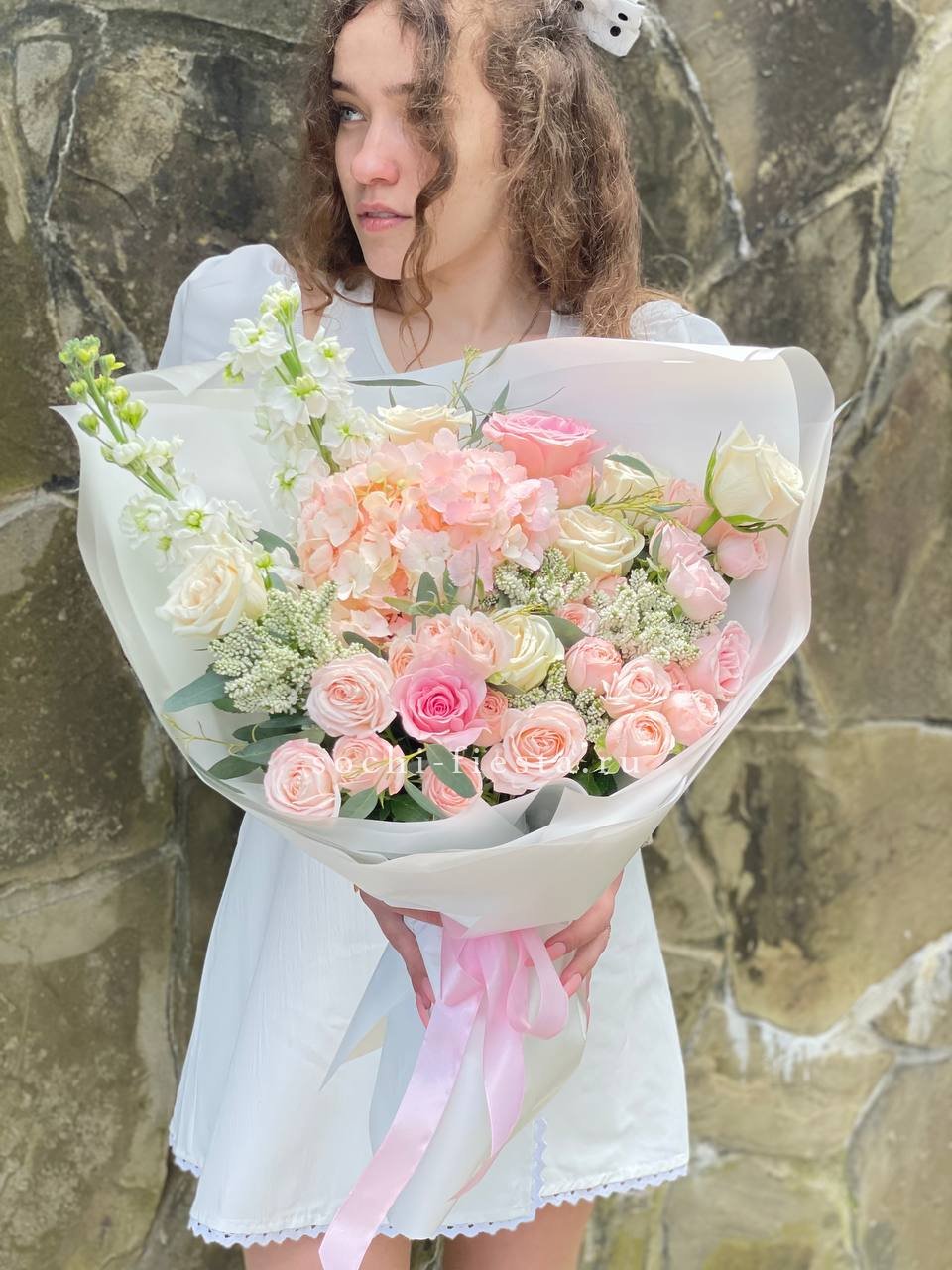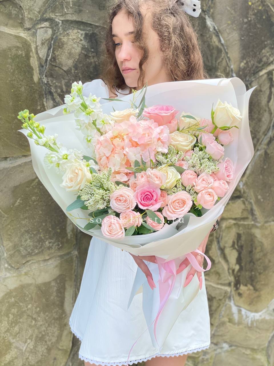 Пышные шапки гортензии переплетаются с бархатными бутонами пионовидных роз, создавая объёмную композицию насыщенного розового оттенка. Орхидеи и эустома добавляют воздушности, а диантус расставляет яркие точки. Букет заполняет пространство и притягивает взгляд своей плотной структурой.