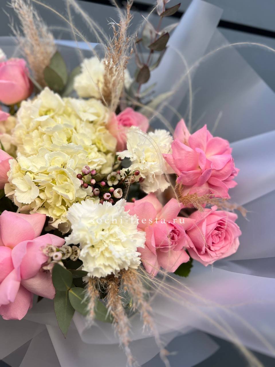 гортензия, протея, хамелациум, диантусы (или эустома), антуриум или лист стрелиции, дизайнерское оформление.