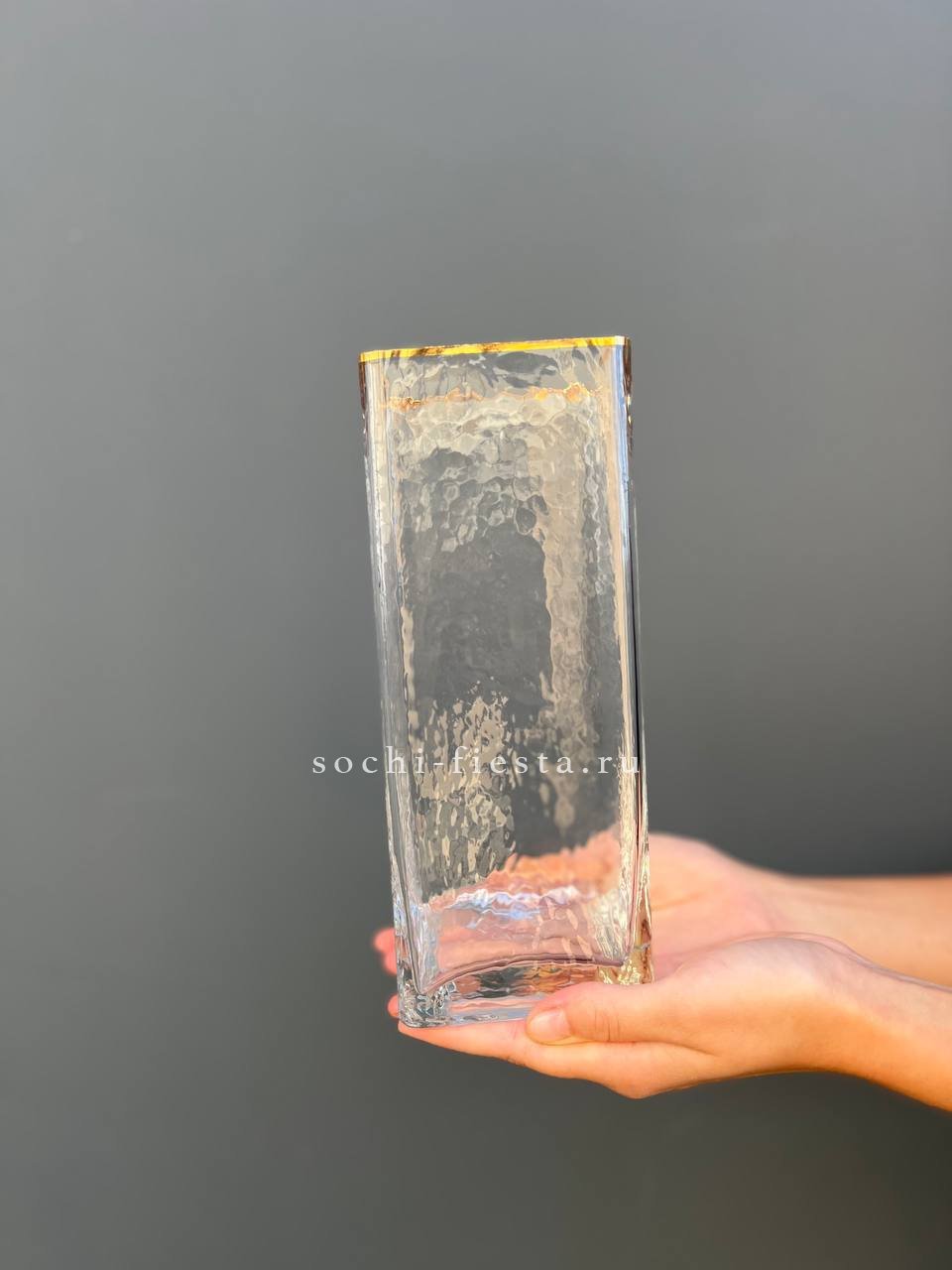 декоративная интерьерная ваза для цветов и сухоцветов с золотистой каймой – это идеальное сочетание элегантности и функциональности. Выполненная из высококачественного стекла, имеет прямоугольную форму, что придает ей современный и изысканный вид. Текстурированная поверхность добавляет изделию дополнительную глубину и интересные световые эффекты, создавая атмосферу уюта и роскоши. Объем 2,5 литра.
