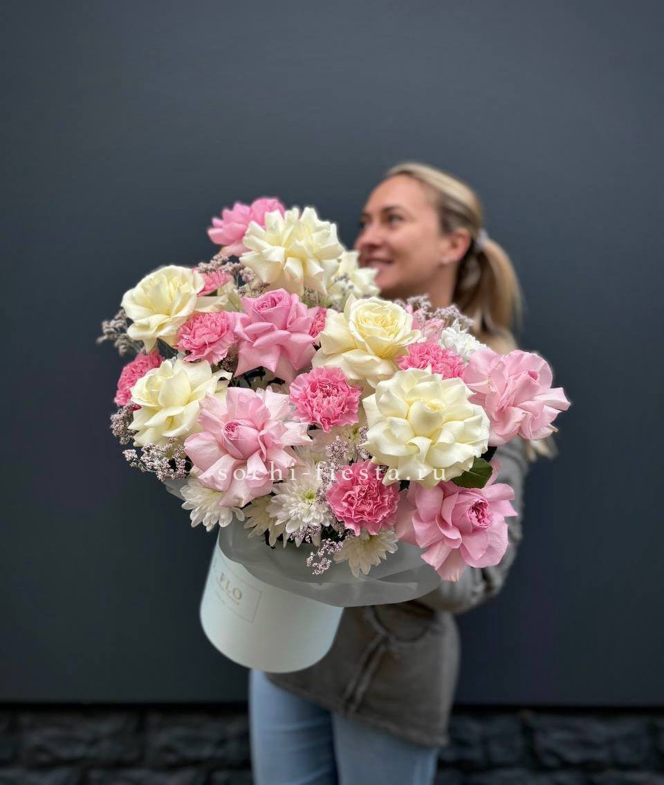 Для заказа товара "Коробка французских роз и диантусов "Бони"" с доставкой в Старом Осколе нажмите в корзину
