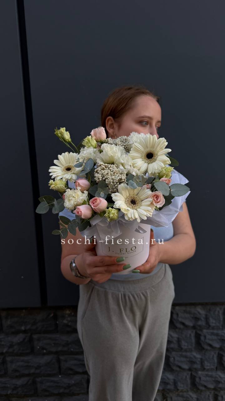 вывернутые белые розы , цилиндр D20, эвкалипт, лента, упаковка.