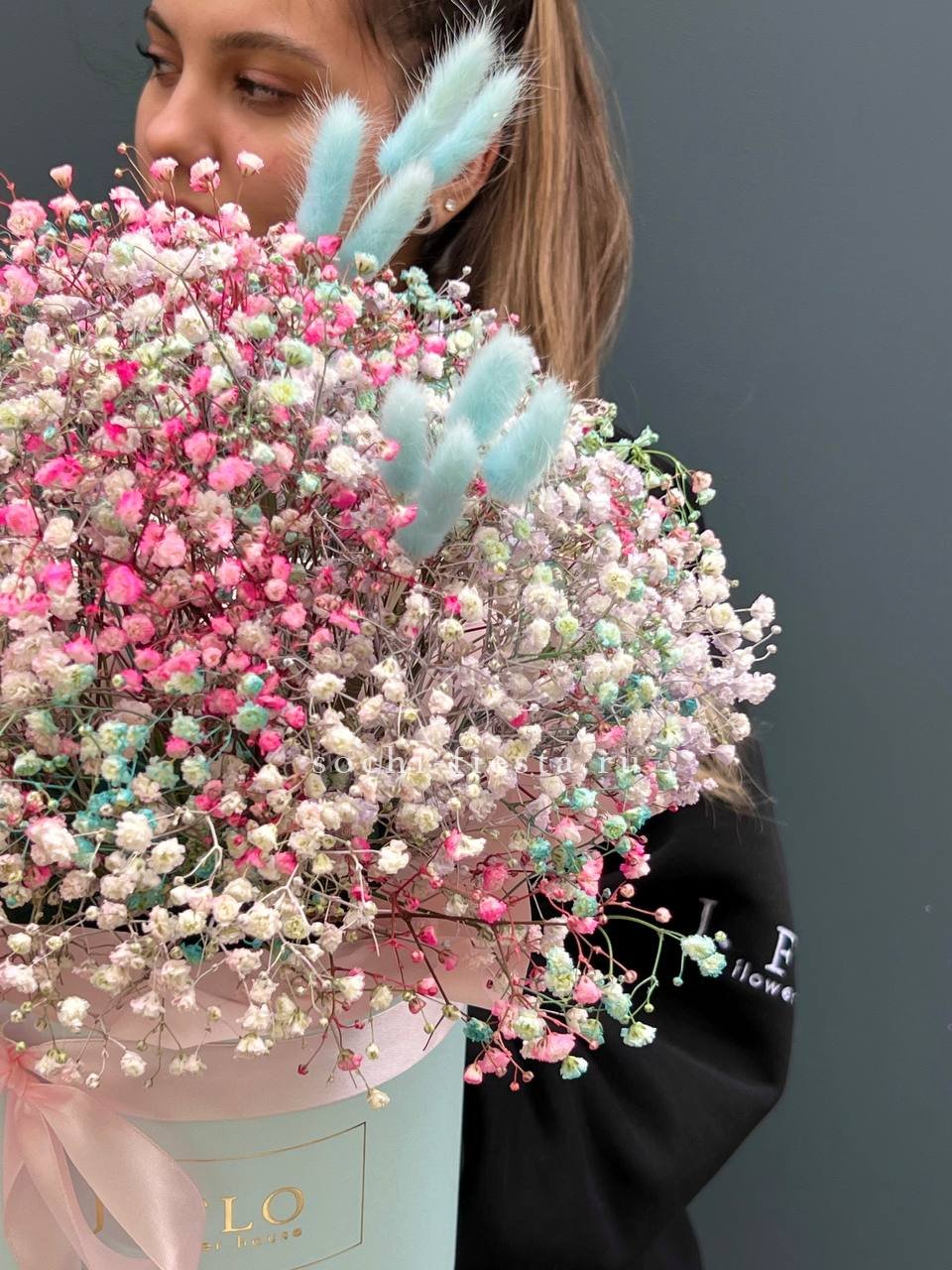 Воздушные ветки гипсофилы окрашены в радужные оттенки и дополнены пушистым лагурусом. Композиция собрана в компактный цилиндр и создаёт яркое цветовое пятно в любом интерьере.