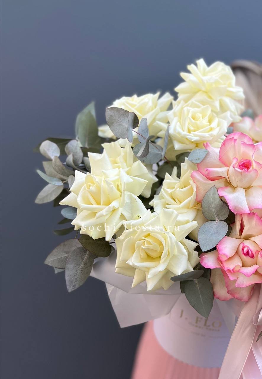 французские розы, кустовые розы, диантусы, матиолла, лагурус, цилиндр D20,  бумага тишью.