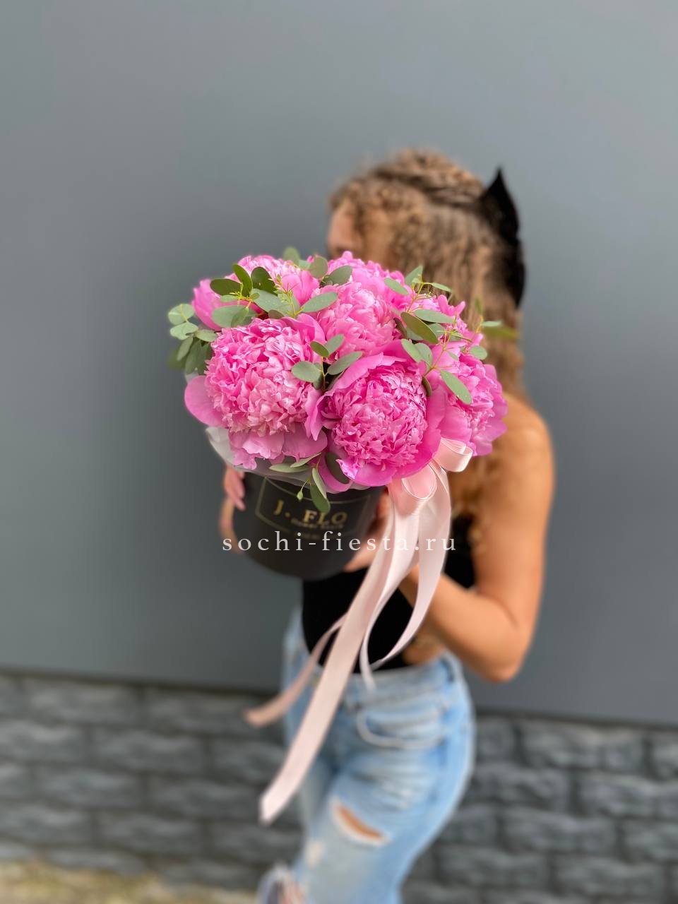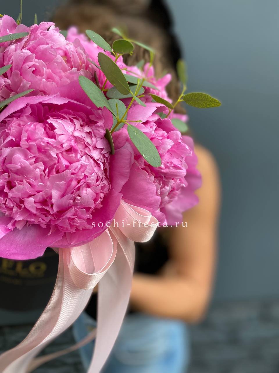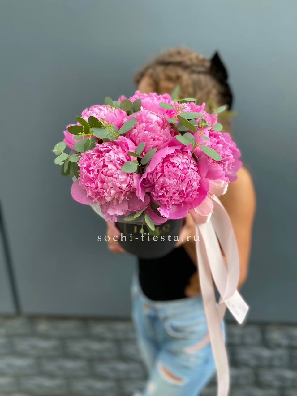 7 пионов, эвкалипт, лента, цилиндр D13.