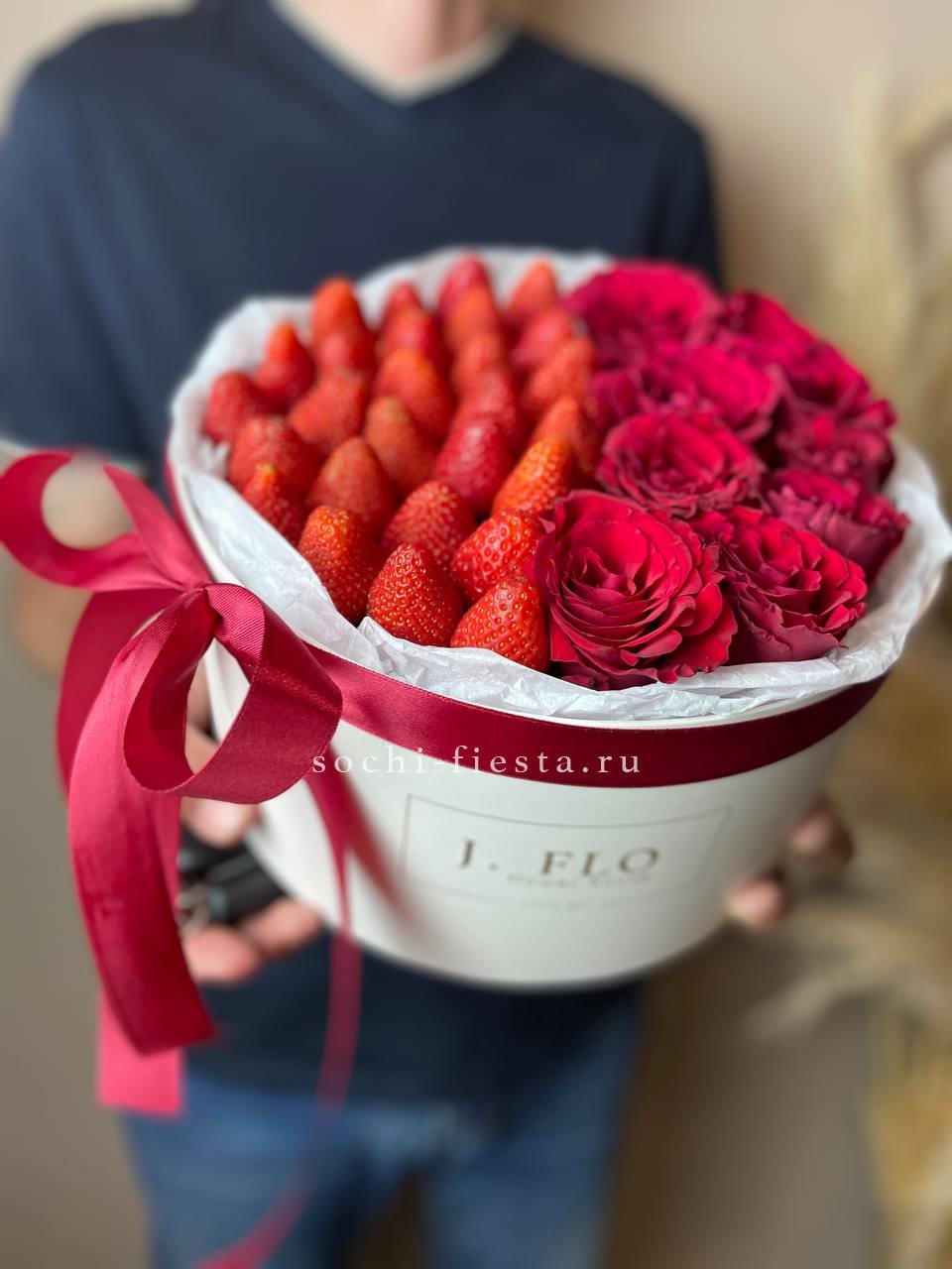 Красные розы соседствуют со спелой клубникой в компактном цилиндре. Сочная ягода добавляет неожиданный акцент, превращая композицию в яркий подарок с характером.