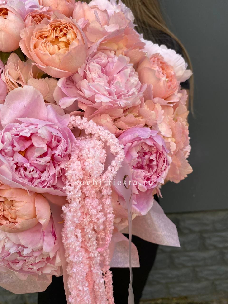 Пионы и кустовые розы собраны плотно, почти без воздуха между бутонами. Гортензия добавляет объём, амарант выстраивает вертикальные линии. Композиция держит форму и не рассыпается.