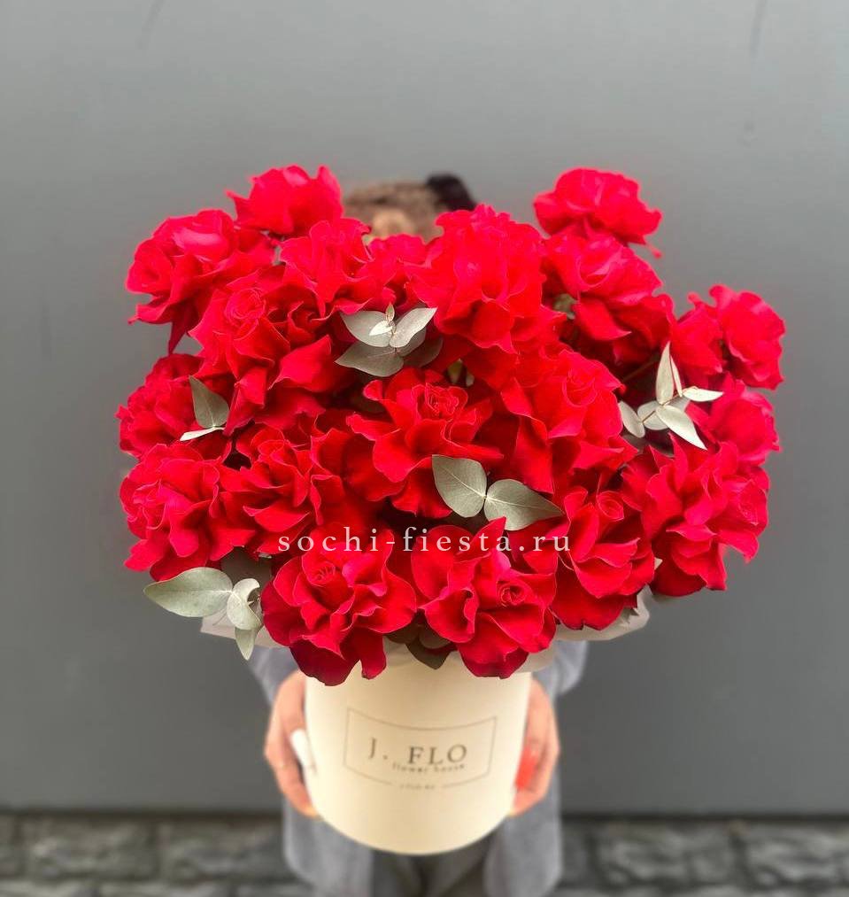 Пионовидные кустовые розы формируют плотный купол с мягкими переходами оттенков. Каждый бутон раскрывается слоями, создавая объёмную текстуру. Эвкалипт добавляет свежести композиции в цилиндре.