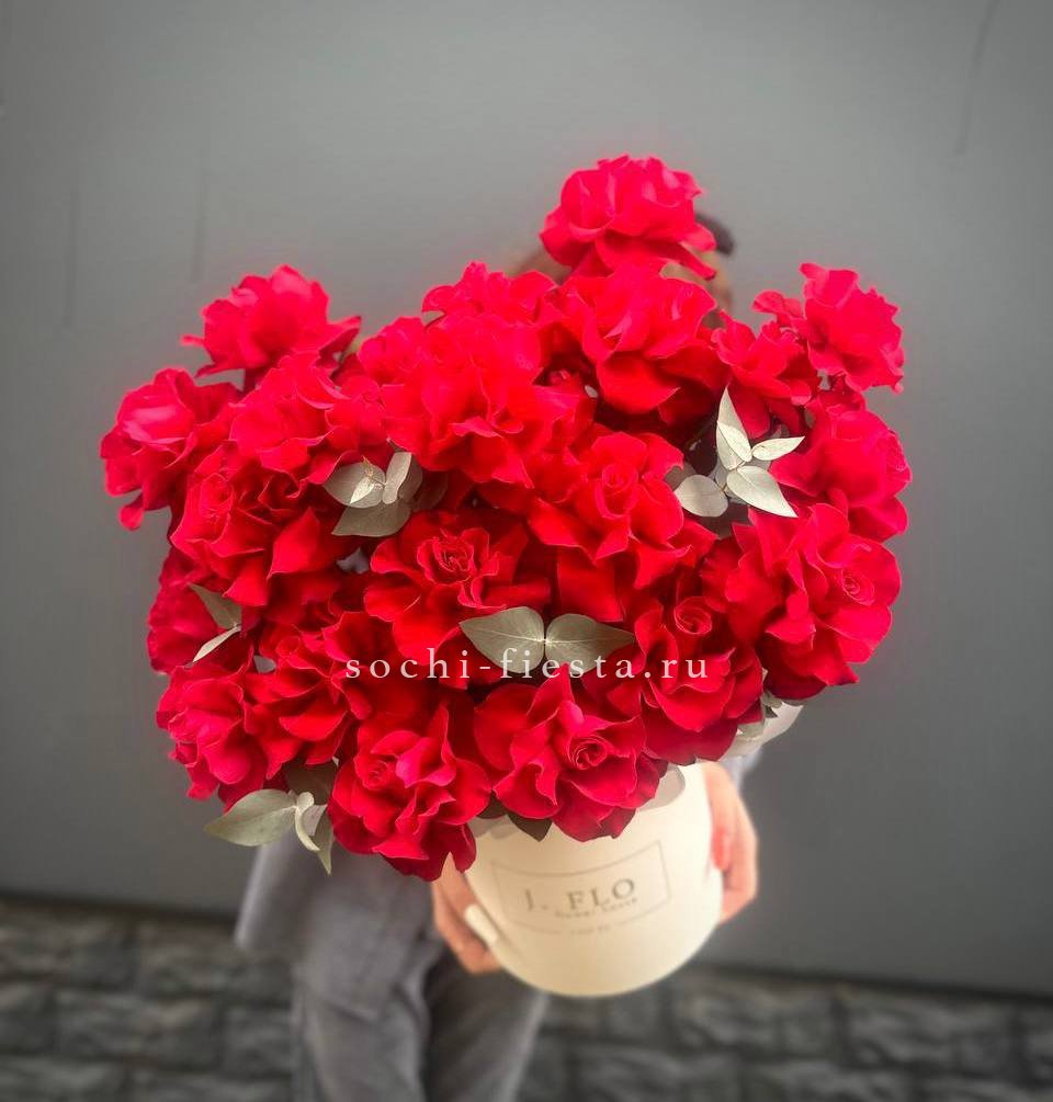 пионовидные кустовые розы 25 шт., эвкалипт, зелень, лента, цилиндр D20.