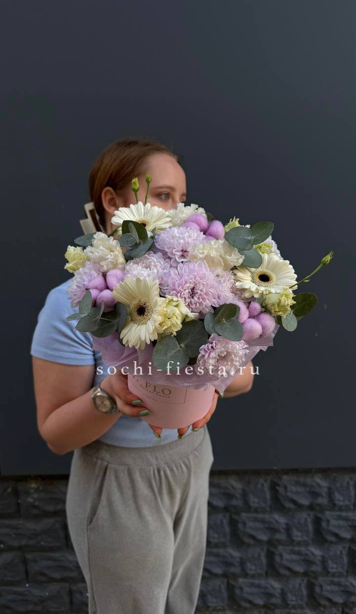 сборный нежный бокс из хризантемы, хлопка, герберы и эустомы.