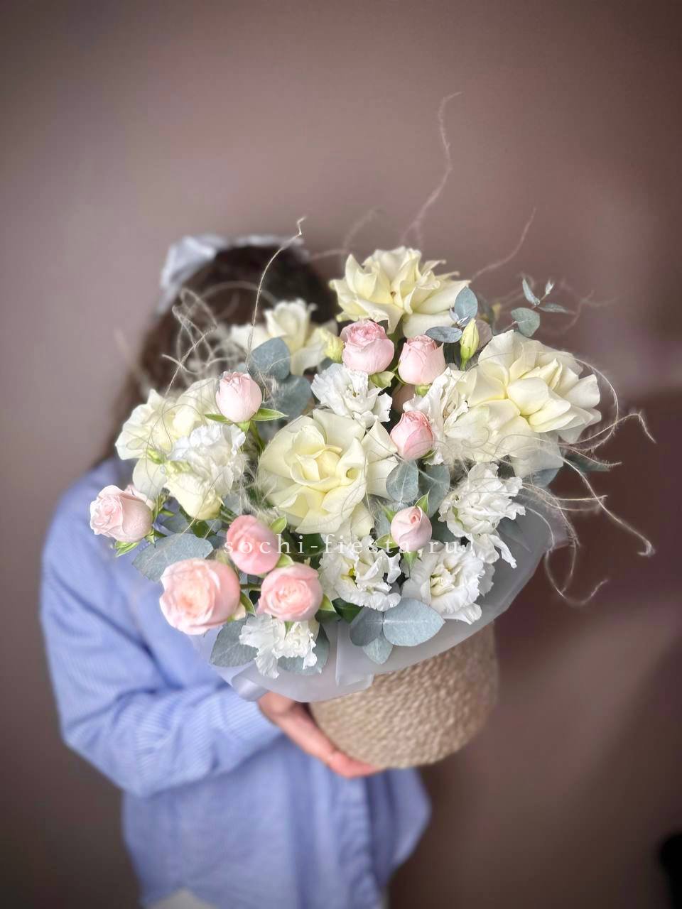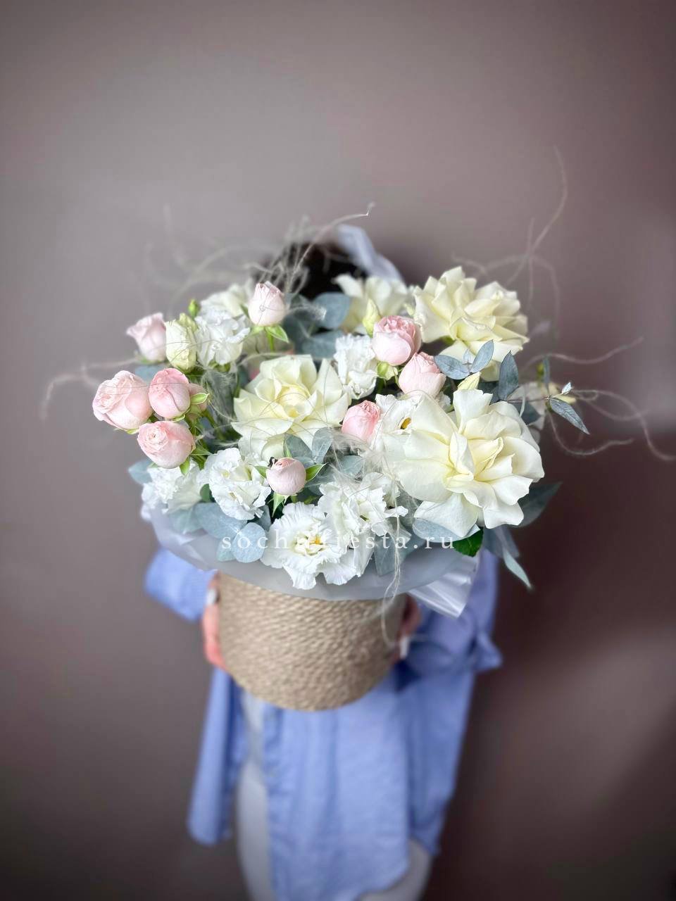 Мягкая палитра белых оттенков с вкраплениями диантуса создает воздушную композицию в натуральном джутовом кашпо. Кустовые розы добавляют объем, а эвкалипт завершает природную гармонию. Готовое решение для интерьера в спокойных тонах.