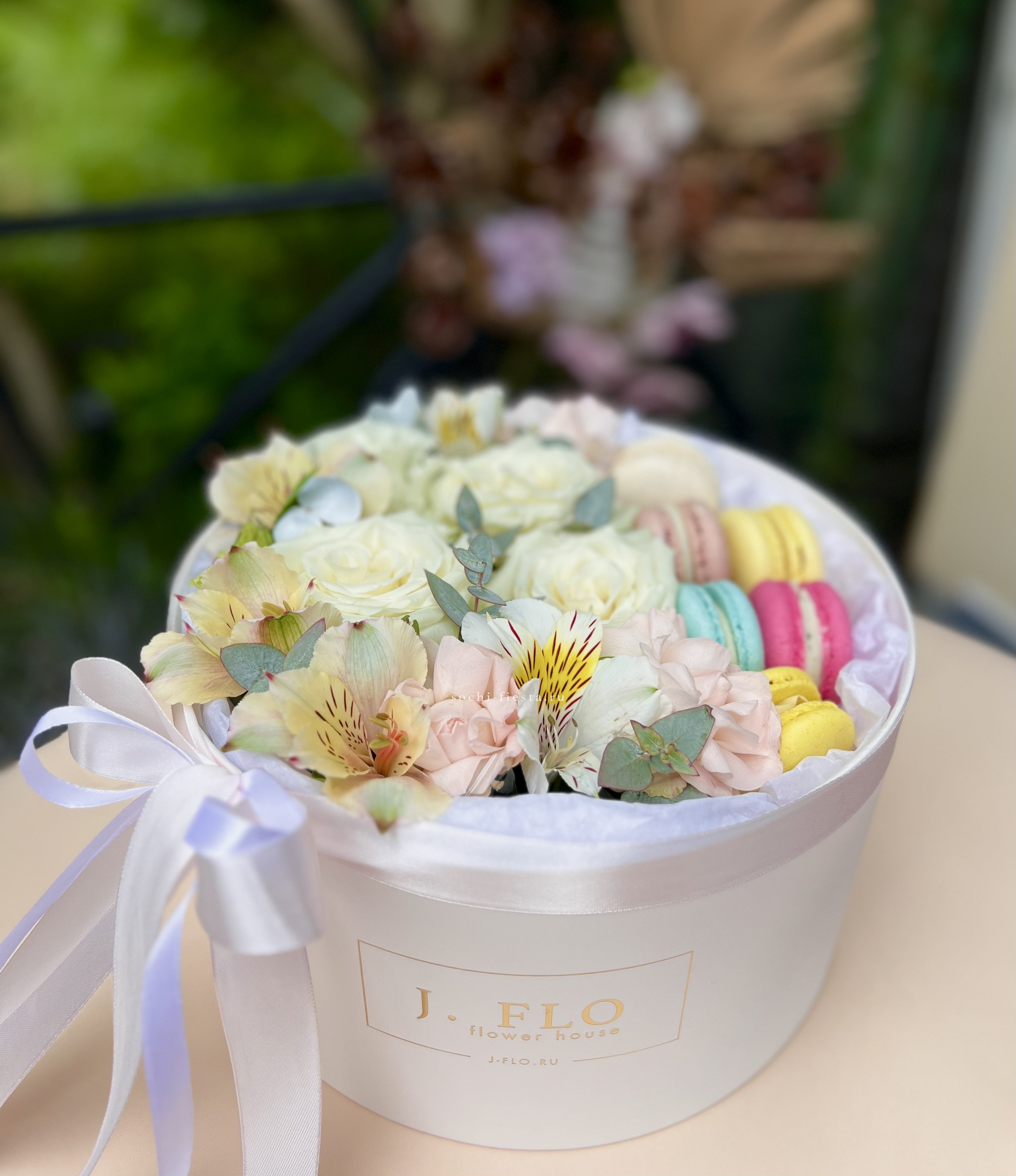 комбинация из цветочных элементов нежных оттенков, 6 макаронс, круглая коробка светлого оттенка.