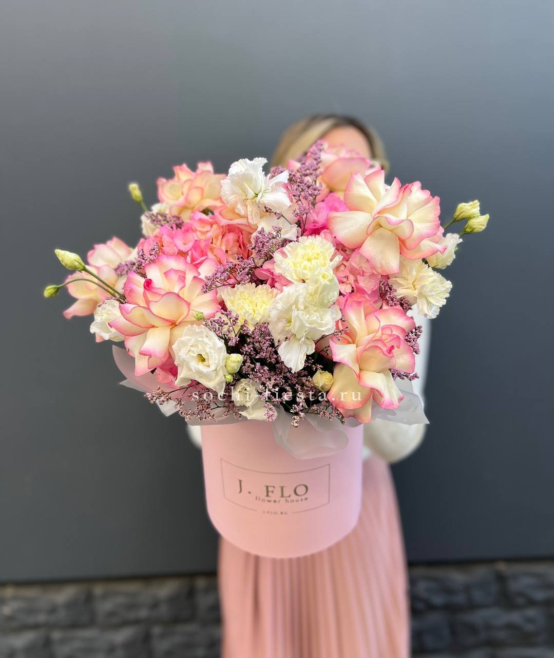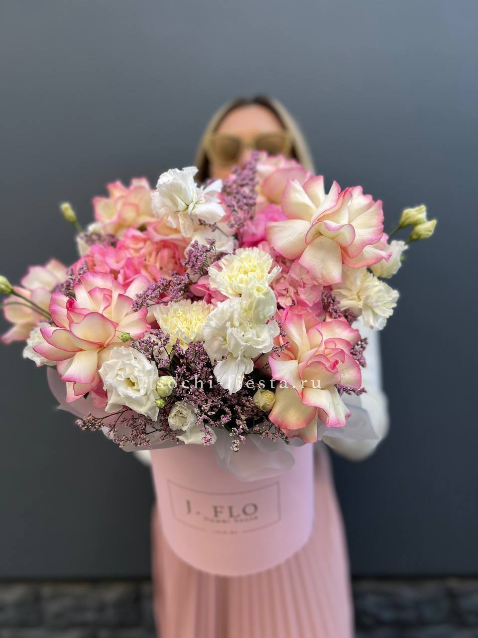 Хризантемы и кустовые розы раскрываются слоями, создавая воздушную текстуру. Эустома добавляет глубину, а эвкалипт формирует естественный контур. Композиция в боксе держит форму и долго сохраняет свежесть.