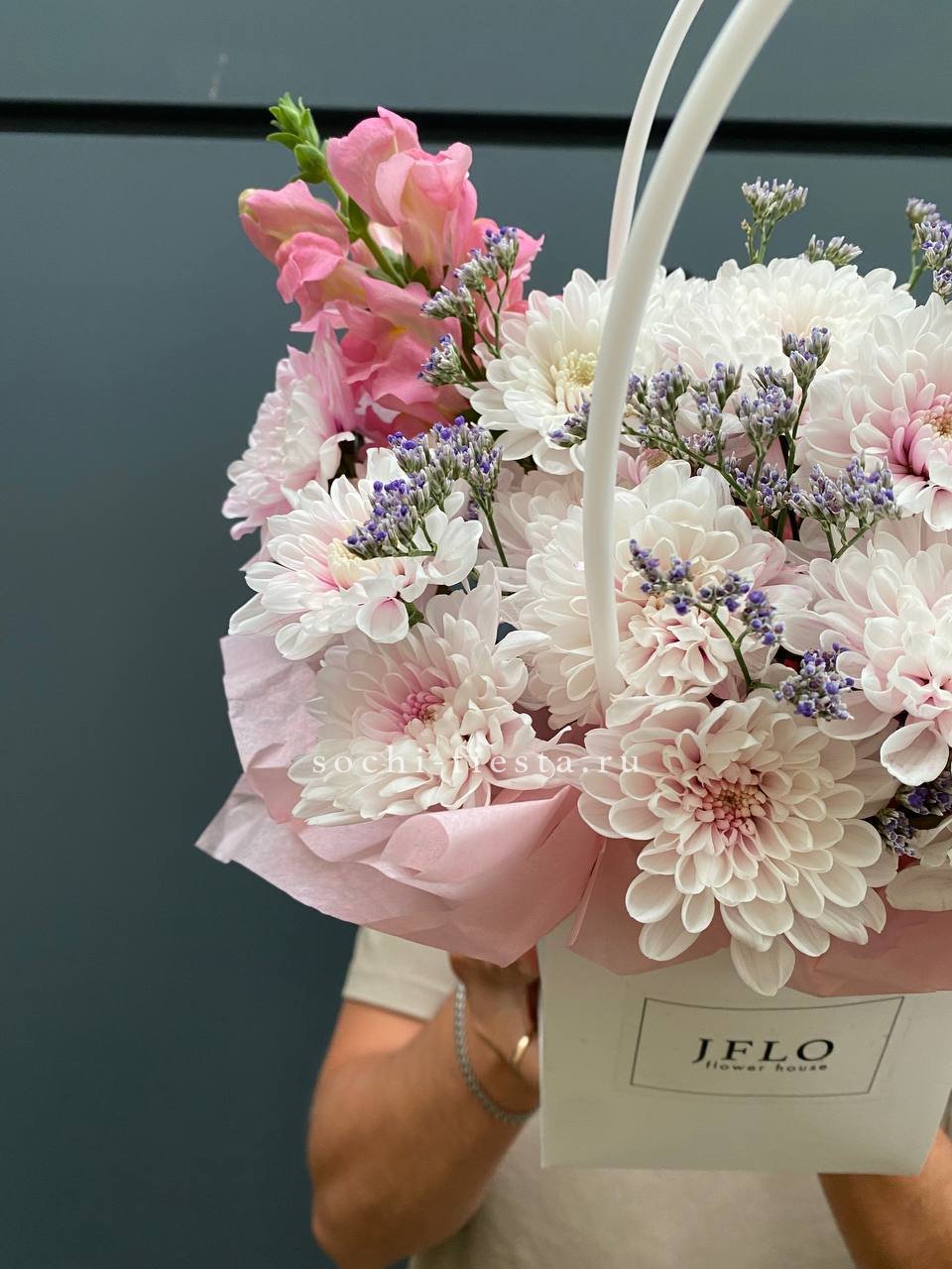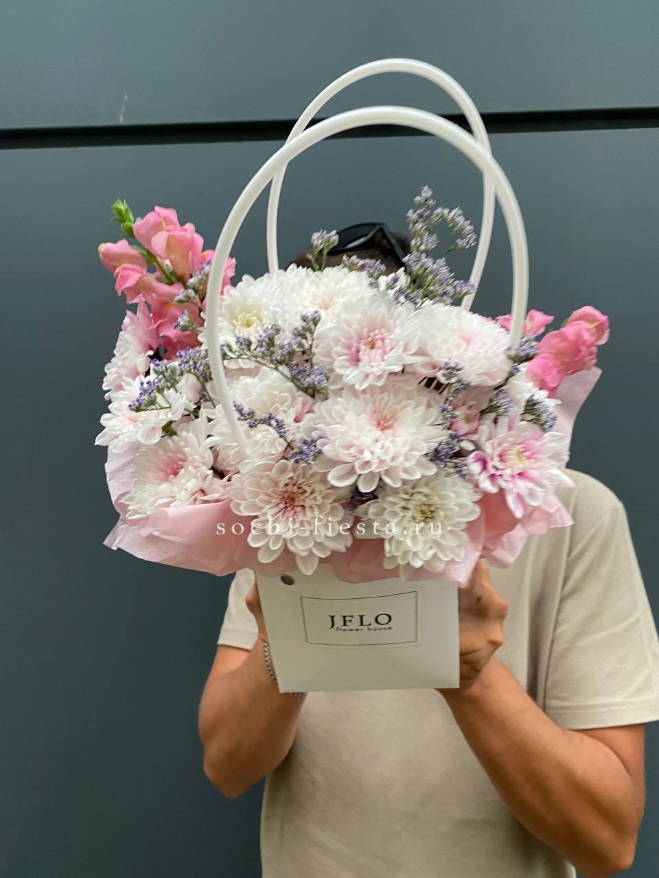 Голубая хризантема в компании воздушного лагуруса напоминает о прохладе летнего утра. Компактная форма в сумочке позволяет разместить цветы на столе или полке без лишних усилий.