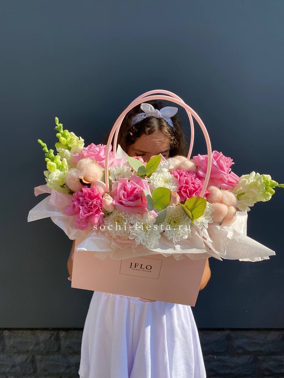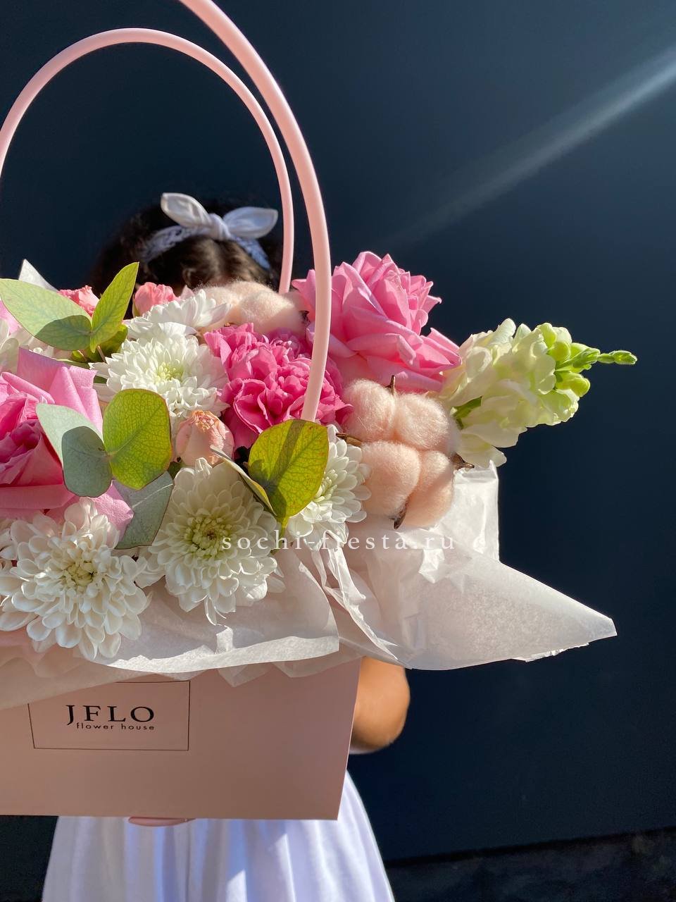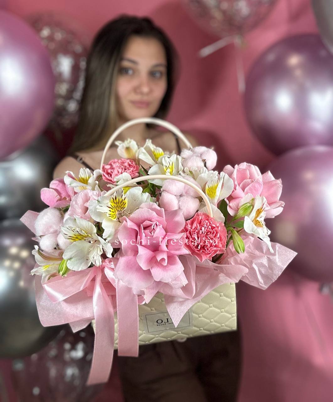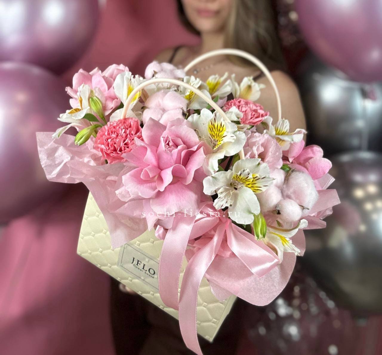 альстромерии (в зависимости от сезона, возможна замена), розовые розы, хлопок, диантусы, лента, сумка-кашпо.