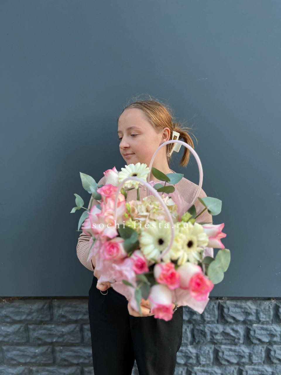 гортензия, джумилия, гербера, сумочка.
